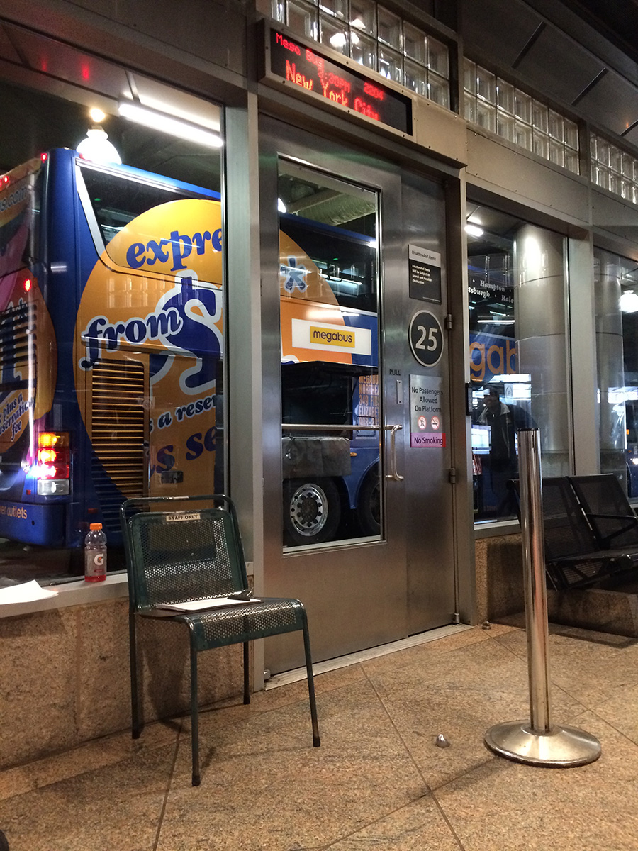 as we made our way to new york city, it became progressively colder. i had my arms folded, legs raised, and even then that wasn't enough. i think the heaters in the front 3-4 seats were broken, and combined with the malfunctioning overhead vents, and some poorly insulated spots in front of the bus, made it incredibly uncomfortable. around the 3 hour mark i decided to switch seats. to play it cool however, i made my way to the downstairs bathroom, checking out the available seating options as i went. i used the bathroom, which was surprisingly clean. i haven't used a bus bathroom in a long time, afraid of the horrors i might find. returning to my seats, i quickly grabbed my things and moved to two empty seats in the center of the bus. so warm! i closed my eyes and went to sleep.