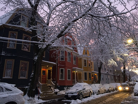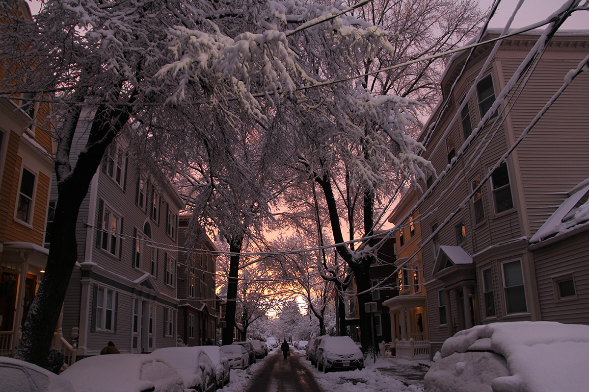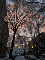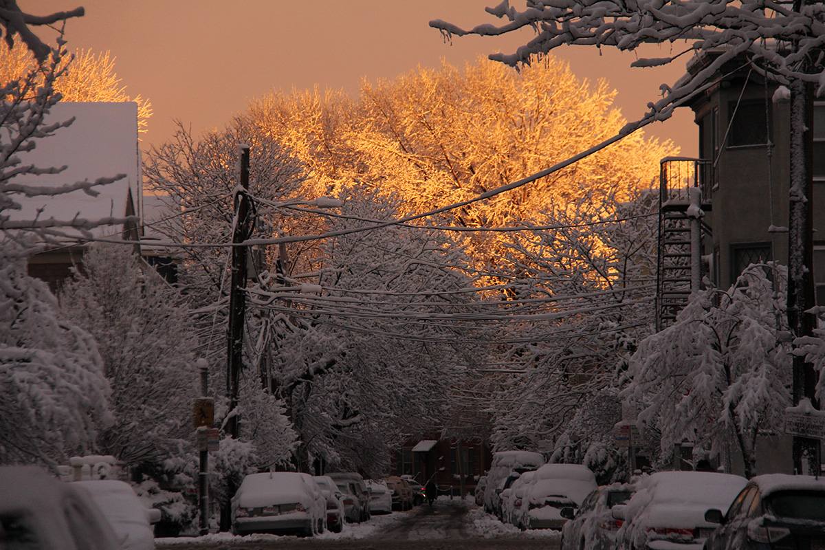of course my good-for-nothing upstairs neighbors didn't shovel the sidewalk while i was gone. i dropped off my things and then outside to clean up. it wasn't very hard, as the snow was still very slushy, and wasn't sticking to anything yet. many other neighbors were out shoveling as well. everyone would stop intermittently to admire the sunset and the snow, and to take photos with their phones.