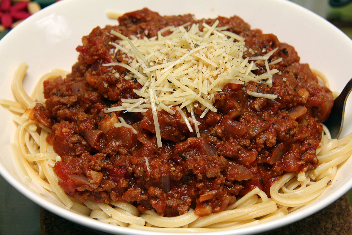 i have a fairly simple spaghetti sauce recipe that requires only 4 ingredients: onion, garlic, ground beef, and a jar of tomato sauce (any flavor). i cook the chopped onion and garlic first (in a bit of olive oil) until they're soft, then i add the ground beef. i wait until the beef is nearly fully cooked (scooping out some reduced beef fat in the process) before adding the tomato sauce. of course i can also dress it up a bit, like add some italian spices (basil, oregano, parsley) and a dash of red wine. the sauce was a little sour at first, but after i cooked everything on a slow simmer for half an hour, all the flavors fused together for a nice sweetness.