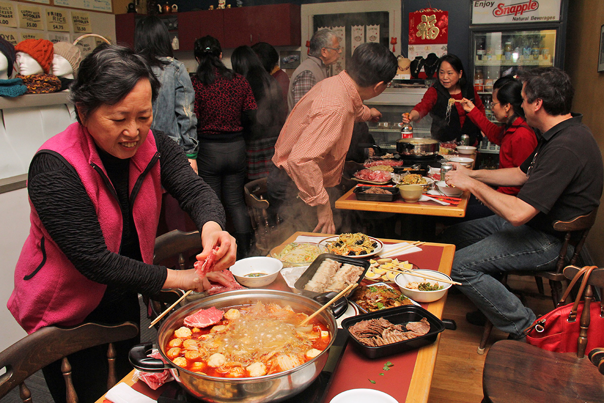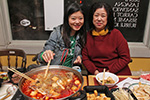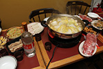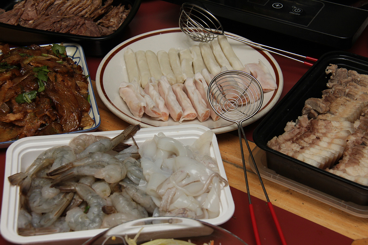 i used a package of chongqing hot pot base, about 3/5th the bag. it's a liquid (oil) base, with some solids which are probably the peppercorns. i never used it before but it has a really good flavor, would definitely buy it again. to make it more authentic, i would probably add even more sichuan peppercorns, and a layer of dried hot peppers for presentation. i ate standing up for most of the time, as the way the tables were set up it was hard for me to reach the hot pot.