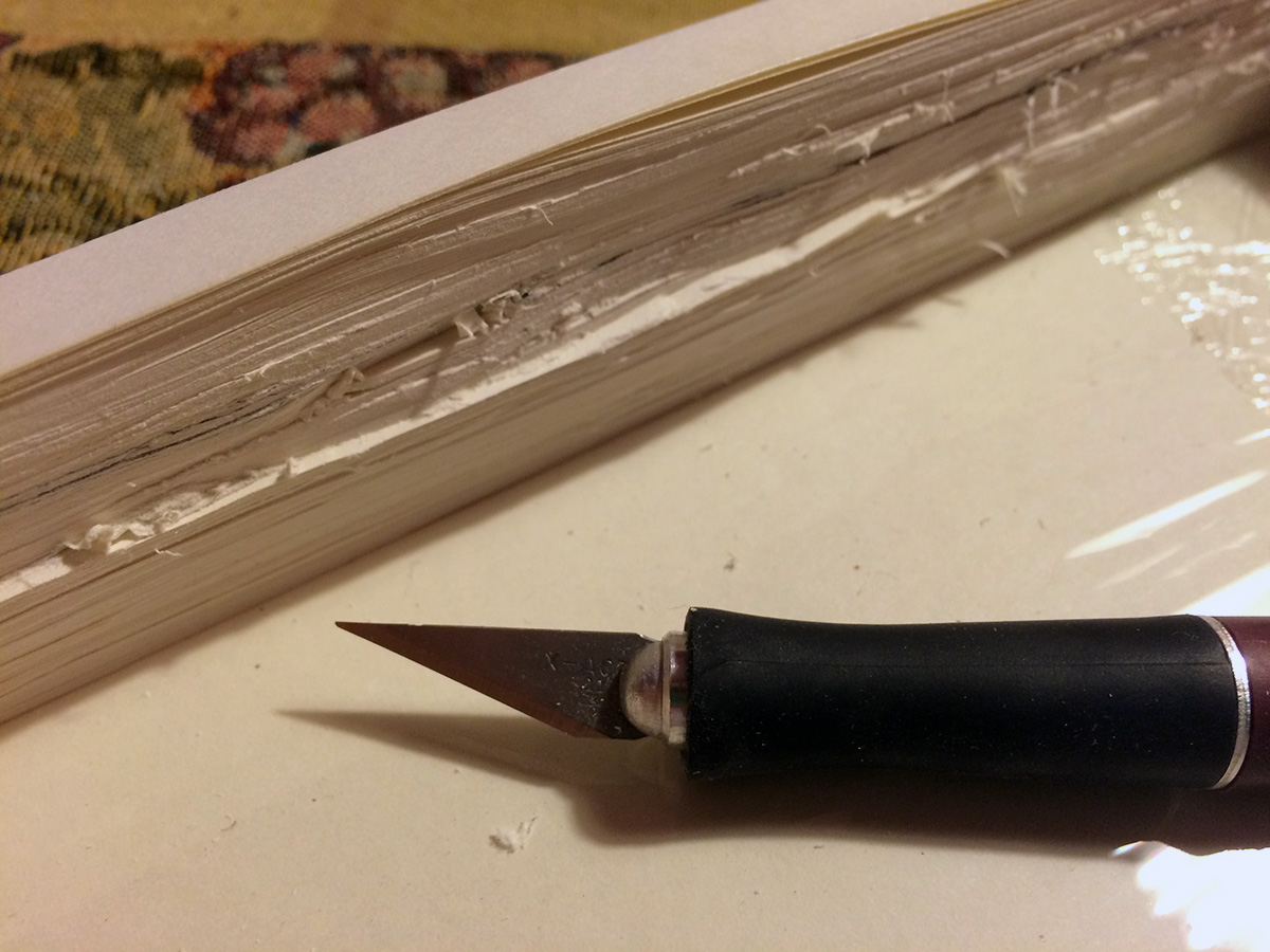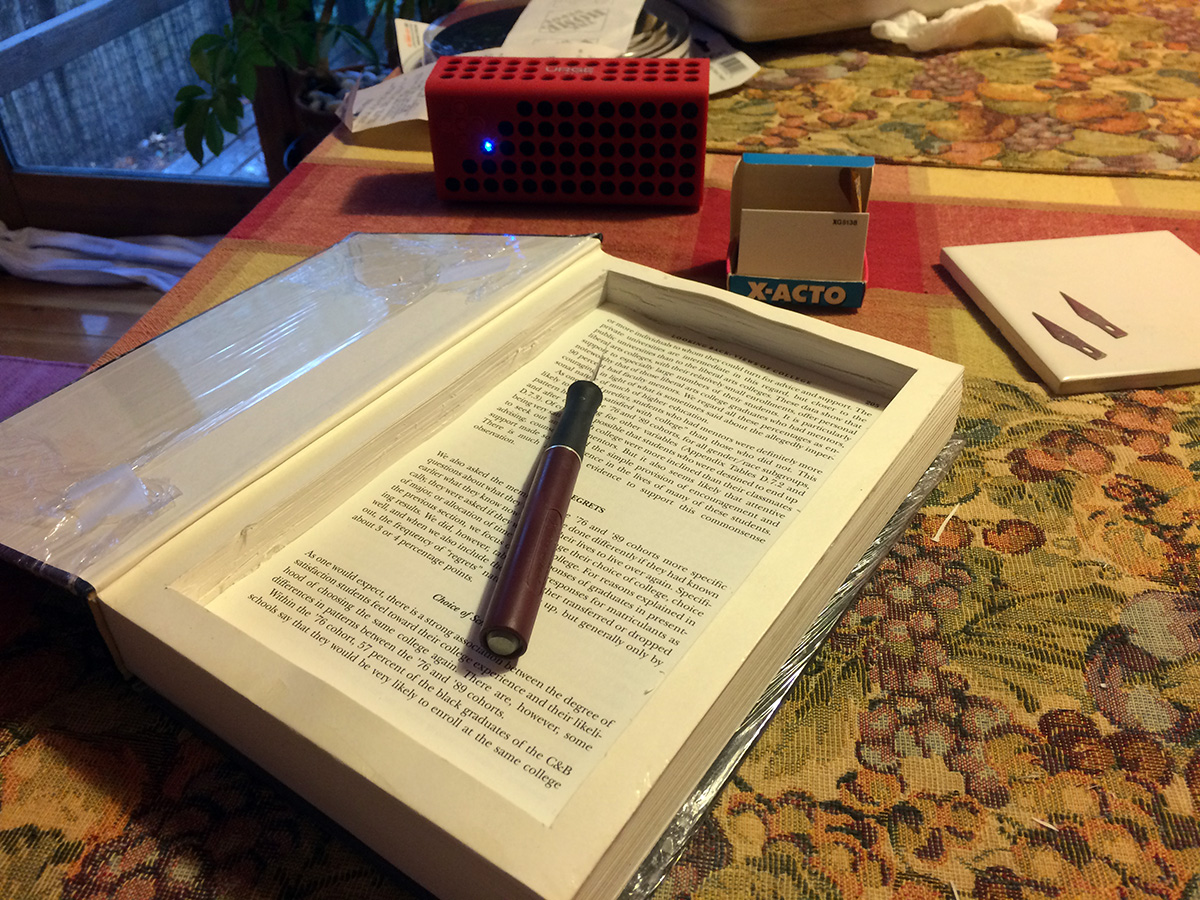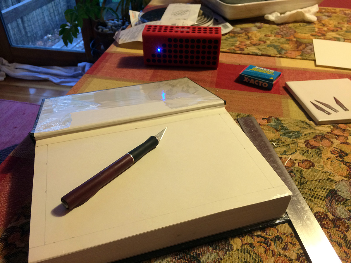 i spent 3 hours in the afternoon finishing a hollow book. not even sure when i started it, must've been back in the fall. i only carved out a few pages, then got sidetracked with other projects. originally i was only going to carve out half, but ended up carving out the whole thing, energized by internet radio streamed to my wireless speakers (rhinestone cowboys, followed by bo diddley, ending with new wave pop). hollow books aren't that hard to make, but it's a tedious process and you have to be detail oriented. and anytime you're working for blades for long periods of time, you have to be careful, don't accidentally slip and cut yourself.