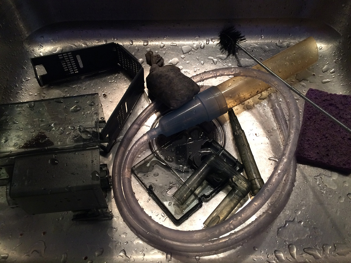 with no fish in the aquarium, i've sort of abandoned routine maintenance like periodic water changes. there was a time when i did it more frequently, but that was to control the slime green algae that seemed to take over the whole tank. i'd scooped out the algae which came out in big booger blobs, then siphon a bucket of tank water, to be replaced by fresh tap water. whatever i did seemed to help because the green slime algae never came back. once the algae problem was solved, it wasn't that important to do frequent water changes. at most i'd top off the tank whenever the water was a bit low, but otherwise i never really took care of it. and since i had the fluorescent light running off of a timer and the water filter operating 24/7 (despite no fish), the aquarium sort of just took care of itself.