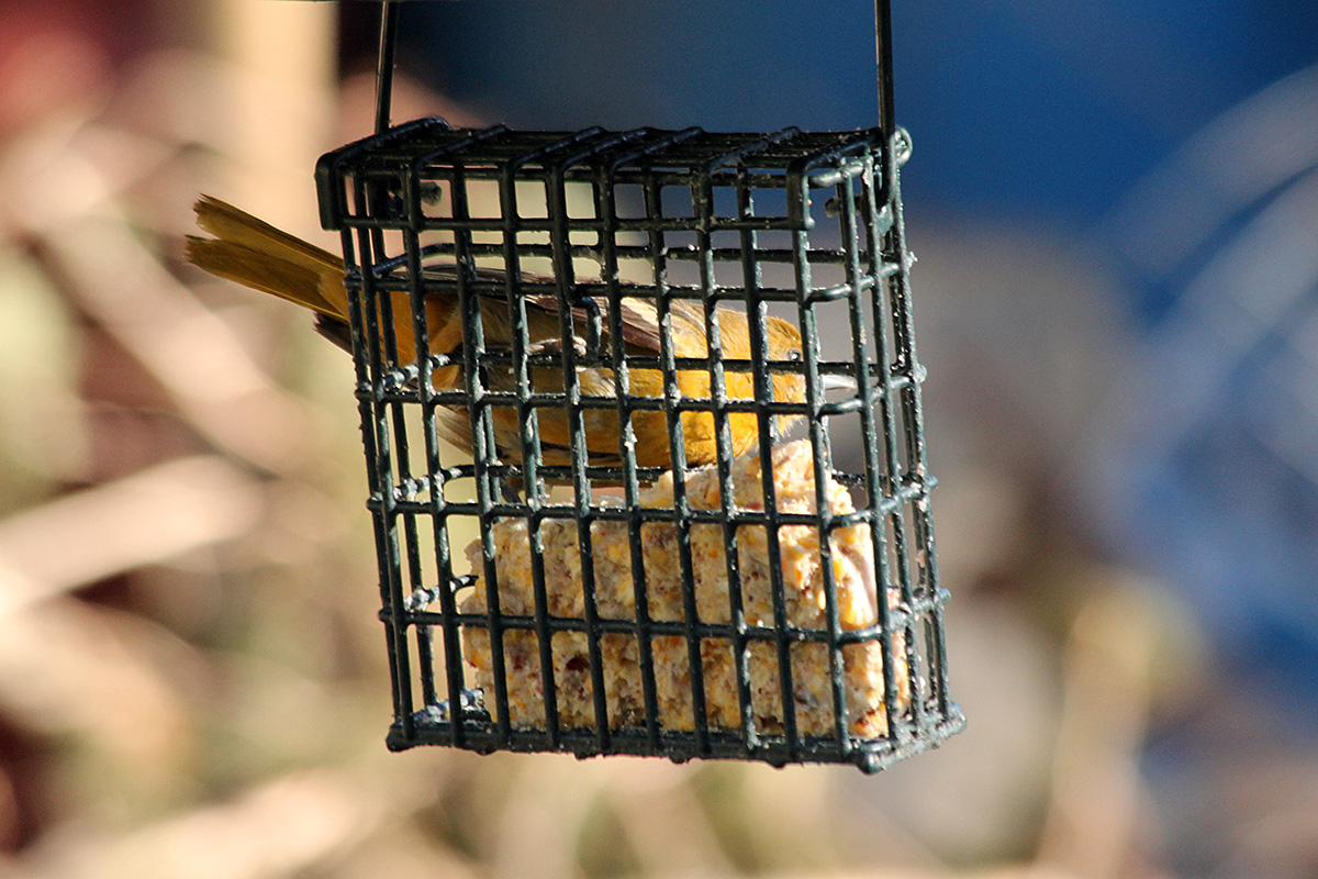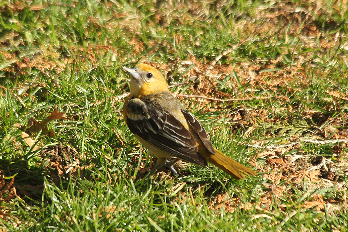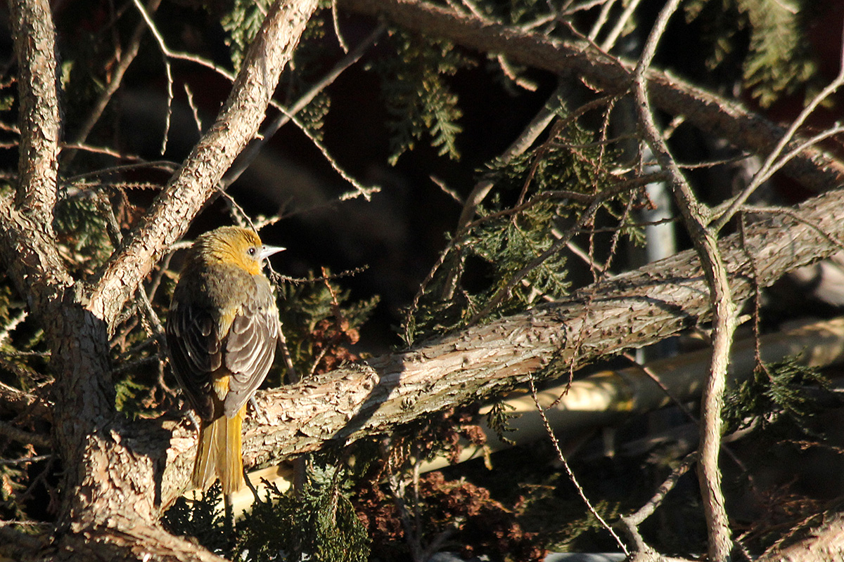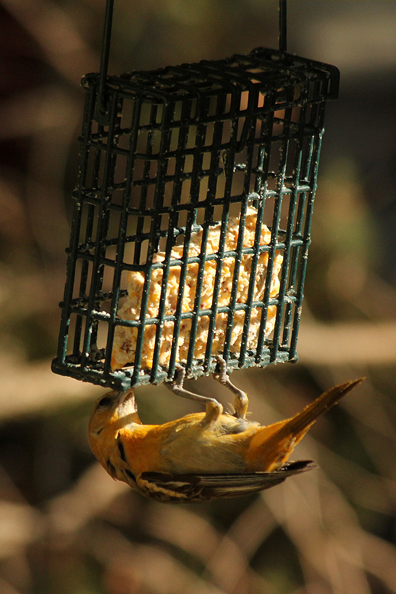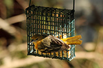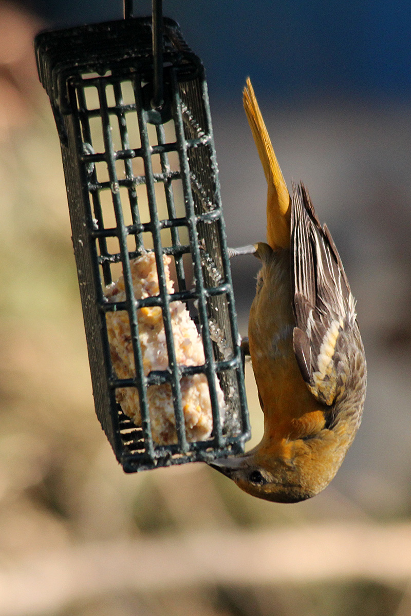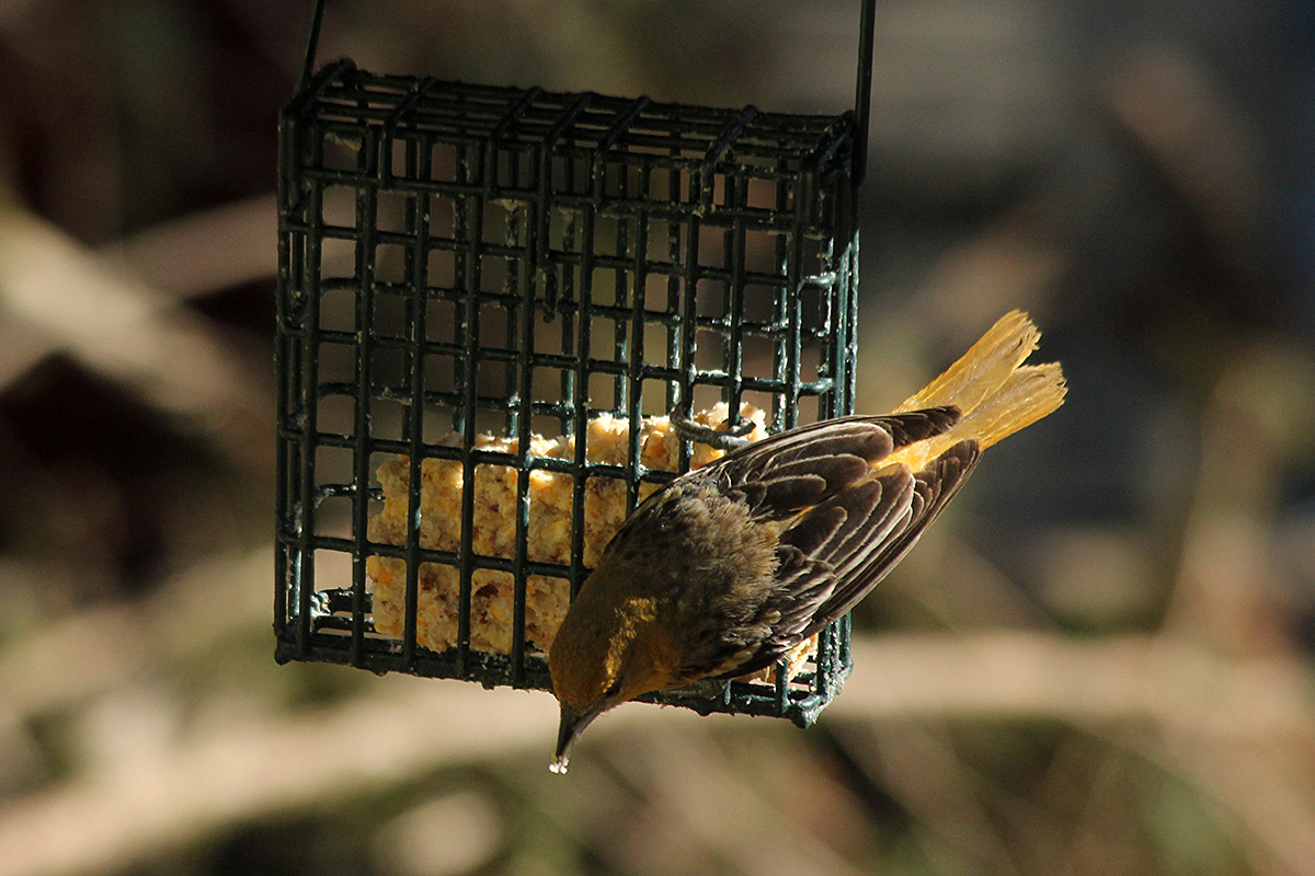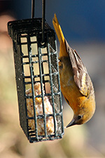 the oriole seems to have made the suet feeder her own. it makes sense, since it's still too early for insects and berries, so the only thing there is to eat is the suet cake. i don't know if she's eating the suet itself or the seeds inside. i also see her stopping occasionally to wipe the suet off her beak on the grass or a branch. i had my dSLR today so managed to get better resolution photos (using the 70-300mm lens). from some of the photos one can definitely see the orange hue on the chest area, indicative of baltimore orioles. it was feeding from the suet feeder so long that none of the other birds dared feed at the same time. on a few occasions downy woodpeckers swooped by but quickly fluttered away. the downys only returned whenever the oriole wasn't around.
