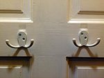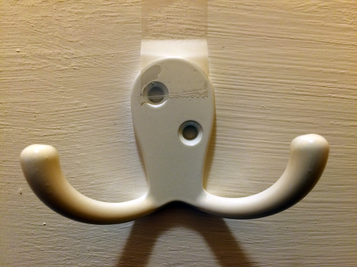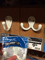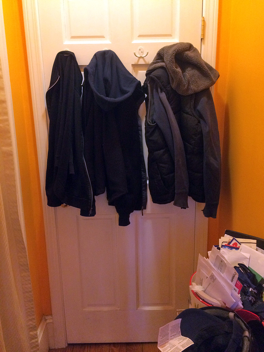 once i got home i began installing my double robe hooks onto the closet door in the foyer. i first taped the hooks onto the door so i could figure out their final positions. then i drilled 3/32 pilot holes before hand-turning the screws. these hooks are pretty solidly mounted, i don't think they're ever going to come off! i tested out some jackets: light and medium jackets are okay, but a heavy winter coat might present some problems because it's so puffy.