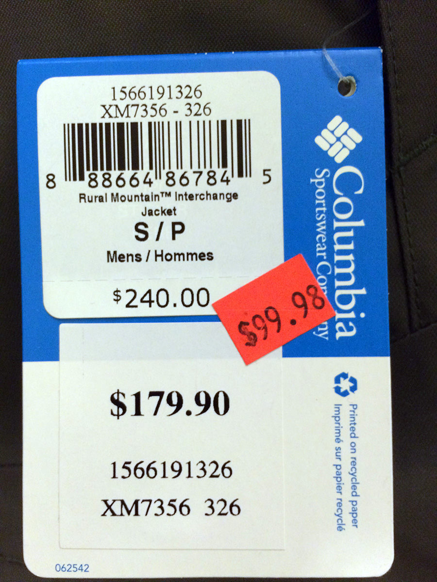 the first place where we spent some money was at the columbia outlet. a lot of items were discounted, but i wasn't impressed with any of the selection. but one can find some real bargains on the clearance ranks. they had a bunch of 3-in-1 interchange jackets that normally sold for $240 but were discounted down to $100. on top of that, there was an additional 40% discount, making each jacket just $60. as if that wasn't enough, there was a special code in the savings booklet my mother picked up earlier for an additional 10% discount, cutting the jacket down to only $54. my father found one that he liked, kind of this hunter orange. nothing really caught my eye, but at that price, i couldn't resist. finally i decided on an olive-grey jacket with black arms. i'm still not in love with the colors, but in regards to winter outerwear, i put more value in functionality than style. when it's crazy cold outside and you've got a warm coat, you don't really care about how it looks. my father loved his new coat so much he removed and tags and wore it out the store.