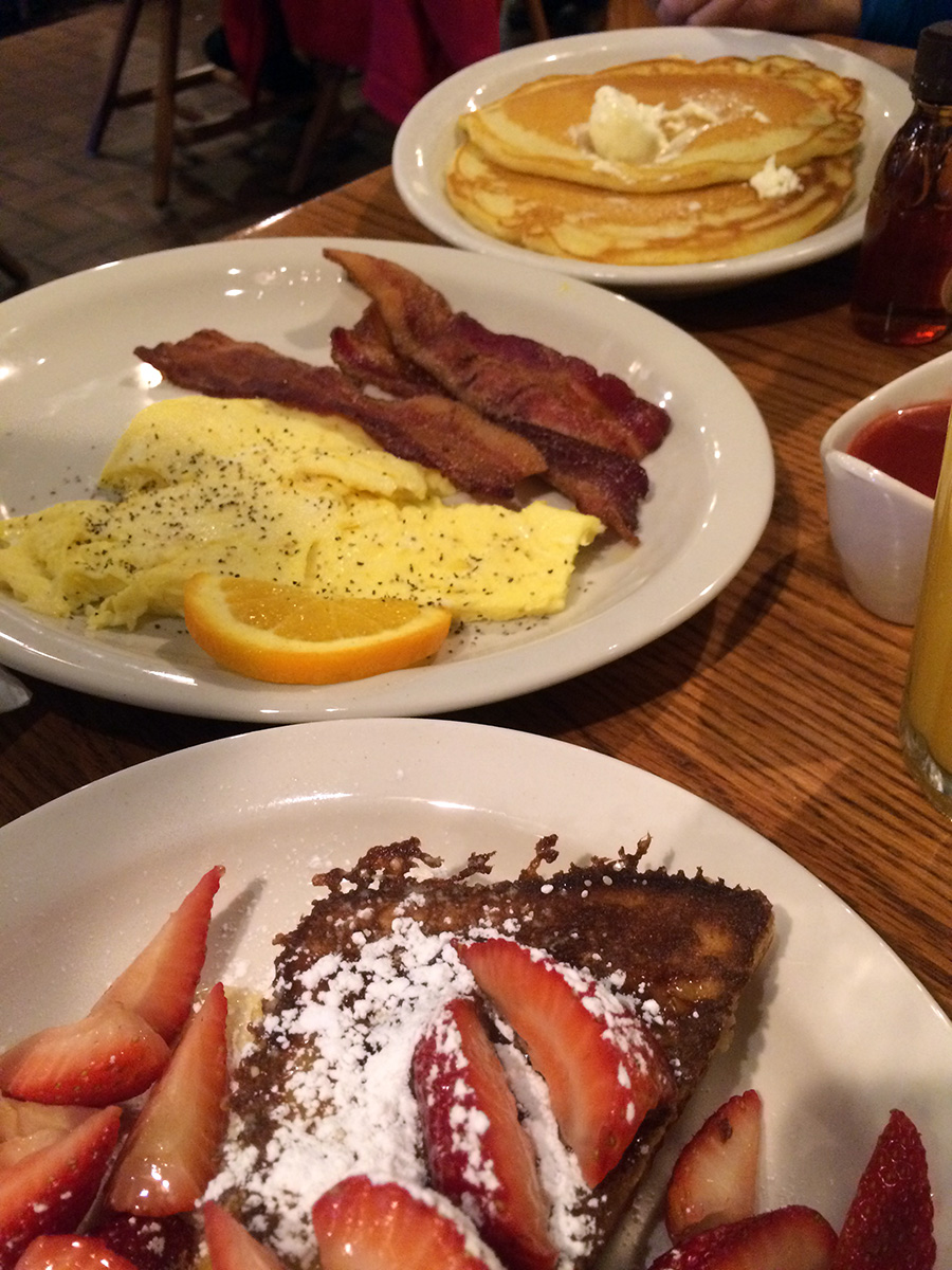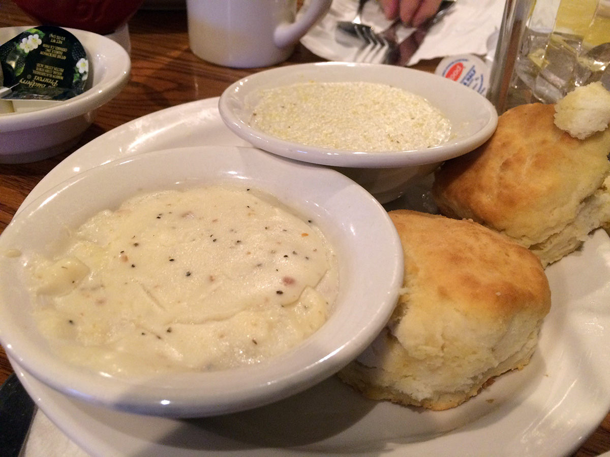 it seems like a lot of people were getting their breakfast on before shopping (the outlets don't open until 10am), because the parking lot was completely filled. we had to park in an adjoining lot of another restaurant that hadn't opened yet. despite being busy, there was still some a good number of empty tables and we managed to get served without waiting. i was disappointed that they had a special breakfast menu, because i wanted entrees. i ended up going with the chicken-fried chicken, with came with scrambled eggs, apple bake, mashed potatoes, grits, and biscuits. both my parents got more traditional breakfast items. one of the great things about eating at cracker barrel was we didn't see any other chinese people. it felt like the good old days, where anywhere we went, we were probably the only chinese family around. as this day progressed, that wouldn't be the case.
