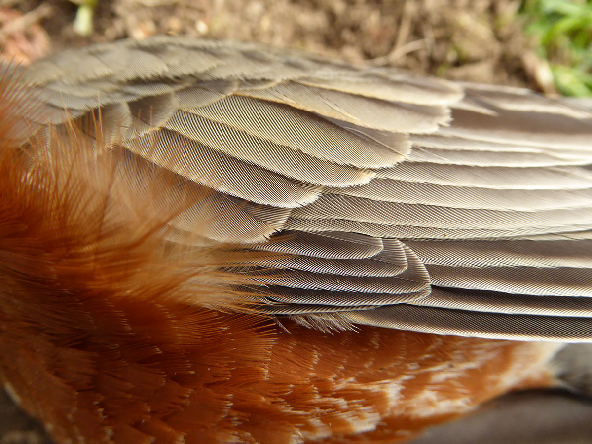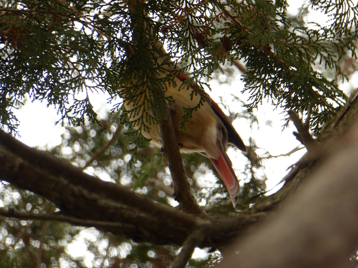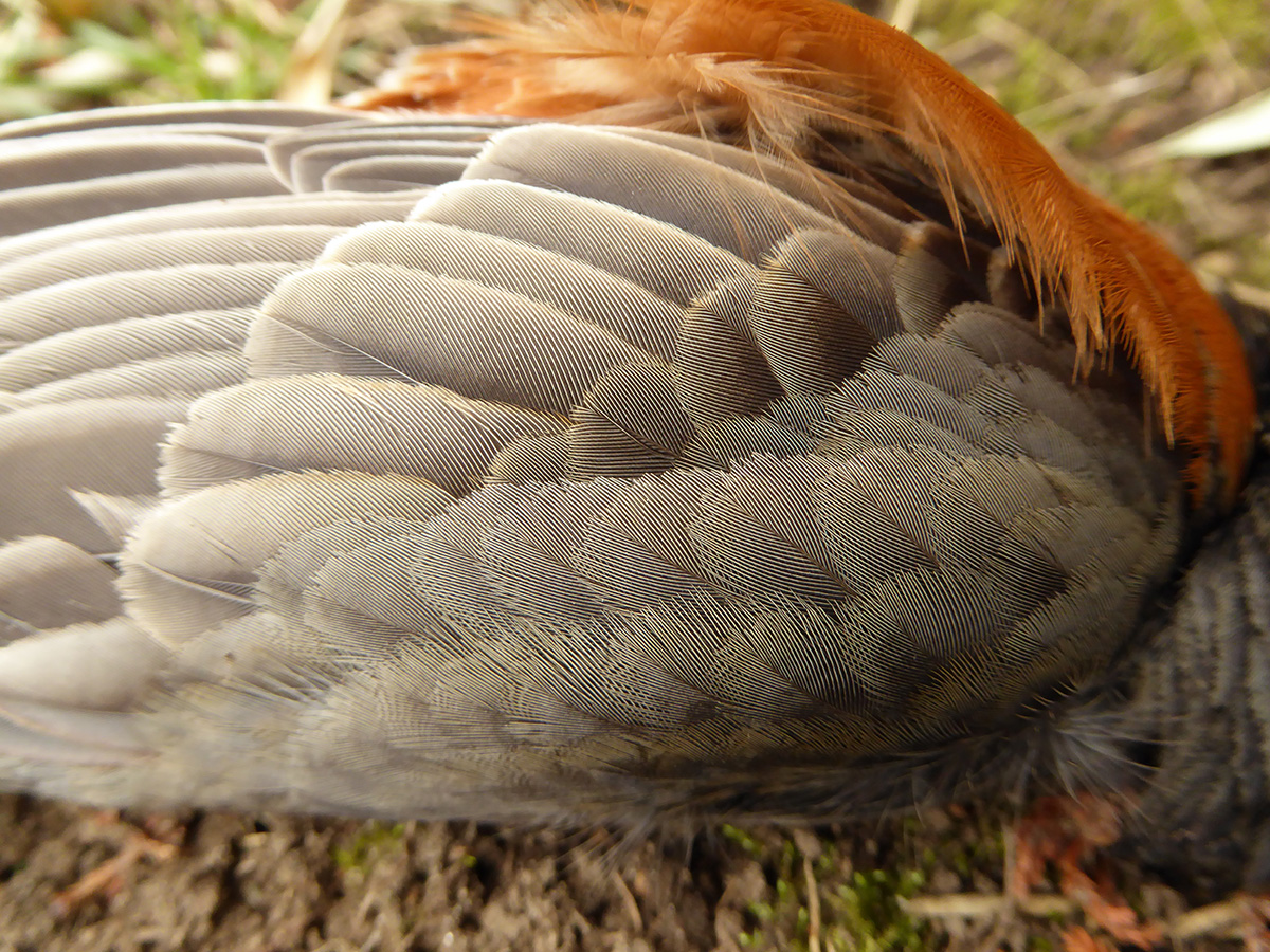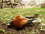 later, from the living room, we were watching the birds visiting the feeder. of in far end of the lawn i noticed something odd, like a pile of reddish-colored leaves, but thought nothing of it. maybe it's a dead bird i thought to myself jokingly. some time had past, and i picked up some binoculars to spy on a squirrel that looked like it was about to cause some mischief. as an afterthought, i panned to the mysterious pile i saw early, and realized what it was: an actual dead bird!
