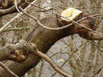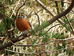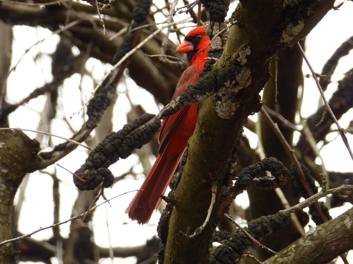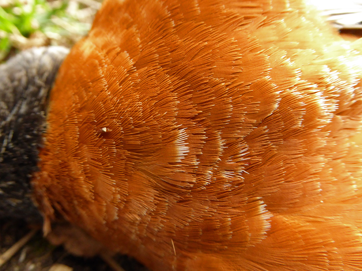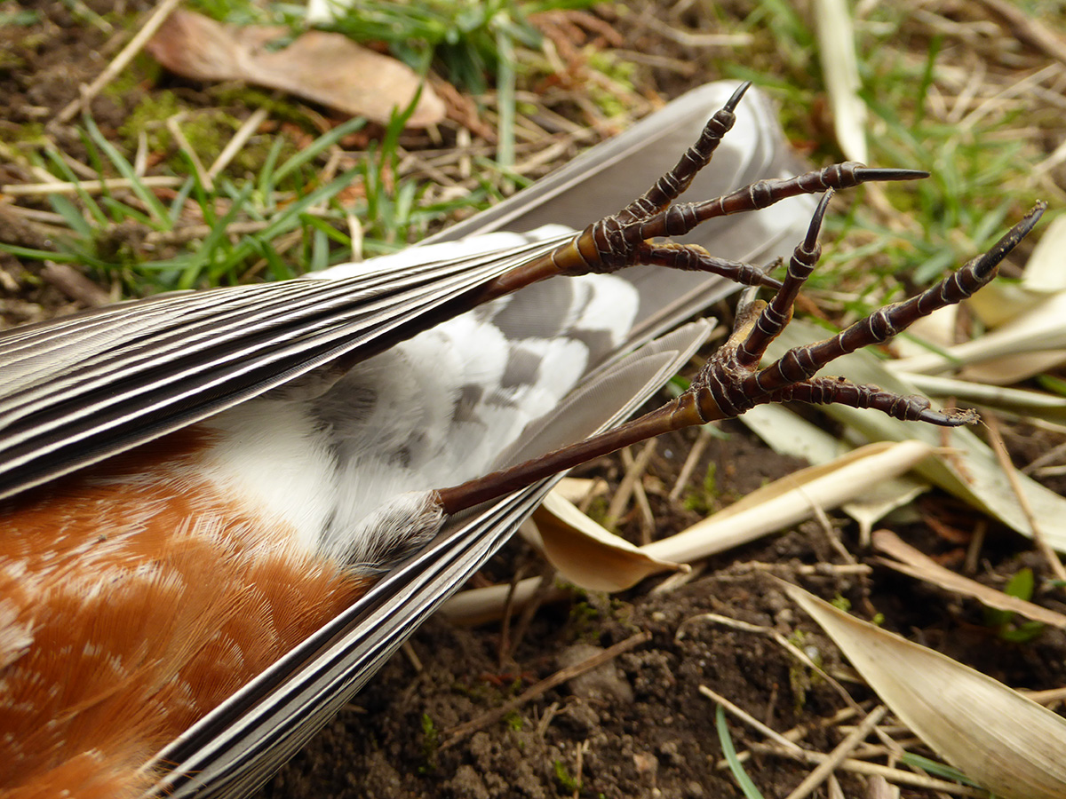 later, from the living room, we were watching the birds visiting the feeder. of in far end of the lawn i noticed something odd, like a pile of reddish-colored leaves, but thought nothing of it. maybe it's a dead bird i thought to myself jokingly. some time had past, and i picked up some binoculars to spy on a squirrel that looked like it was about to cause some mischief. as an afterthought, i panned to the mysterious pile i saw early, and realized what it was: an actual dead bird!