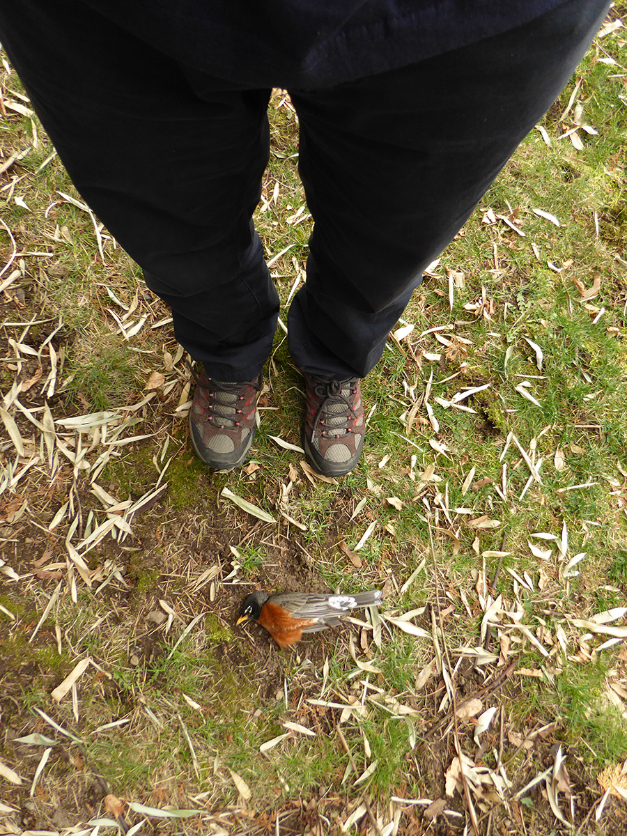 a lot of bird activity in the backyard, but no new birds to report. i was startled when i saw something skittering out from the pile of cold frame debris between two raised beds. i thought it was a rat at first, but then saw that it was only a robin. could it be the robin i saw yesterday? why is it still lurking around the yard? maybe it's trying to build a nest nearby. i was surprised by how tame it was, only hopping away far enough so i couldn't catch it, instead of just flying away.