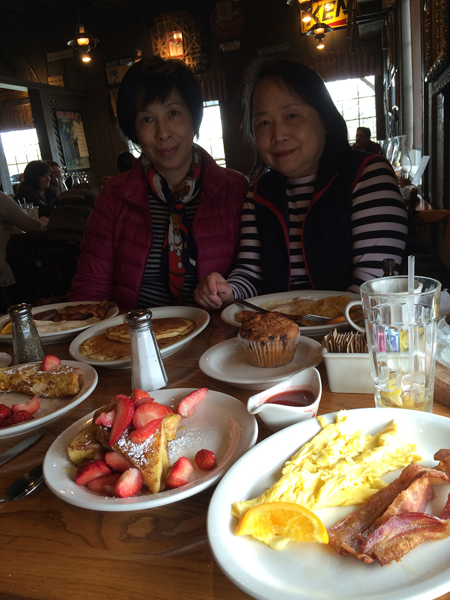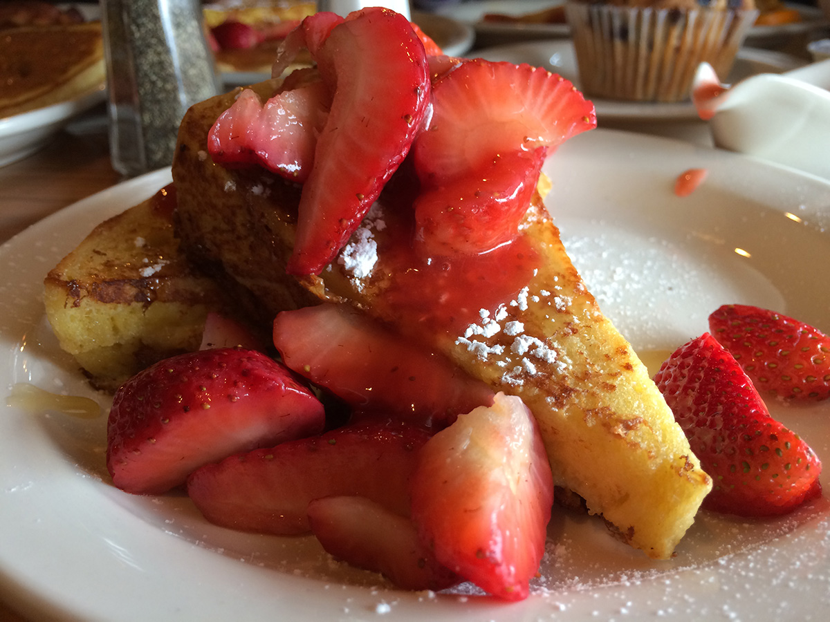 we arrived at wrentham outlet an hour earlier than last time. we got breakfast at cracker barrel, early enough that the parking lot was only half full (it was completely full last time). the host gave us a table by the window, where i could see our car parked outside. i decided on a more typical breakfast meal compared to the chicken fried chicken i got last time, and picked the strawberry-lemon french toast (stuffed with cream cheese)