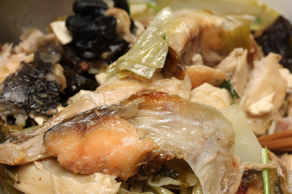 due to the rain the cafe wasn't busy so my father closed early and came home around 2pm. for dinner we had chinese sauerkraut fish stew with rice (é…¸èœé±¼), using one of the chongqing fish stew packages i brought back from china. my mother used fish heads which has a particularly fish flavor that i didn't like, but i did like the occasional bites of numbing sichuan peppercorns.