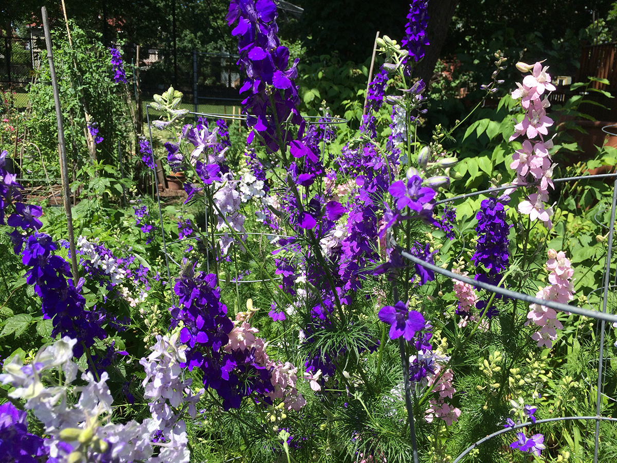 i planted the eggplants which was an ordeal in the hot weather. by the time i was done, my face was covered in sweat, streaking all over my glasses. there's probably a good reason why nobody visits the garden in the middle of the day. i got the hose and watered the garden. i also did a bit of weeding (pulling out some crabgrass and wild morning glory seedlings) and set up some tomato cages to prevent some of the taller larkspurs from toppling over. i also caged a single wild tomato, maybe that's my only tomato of the season.