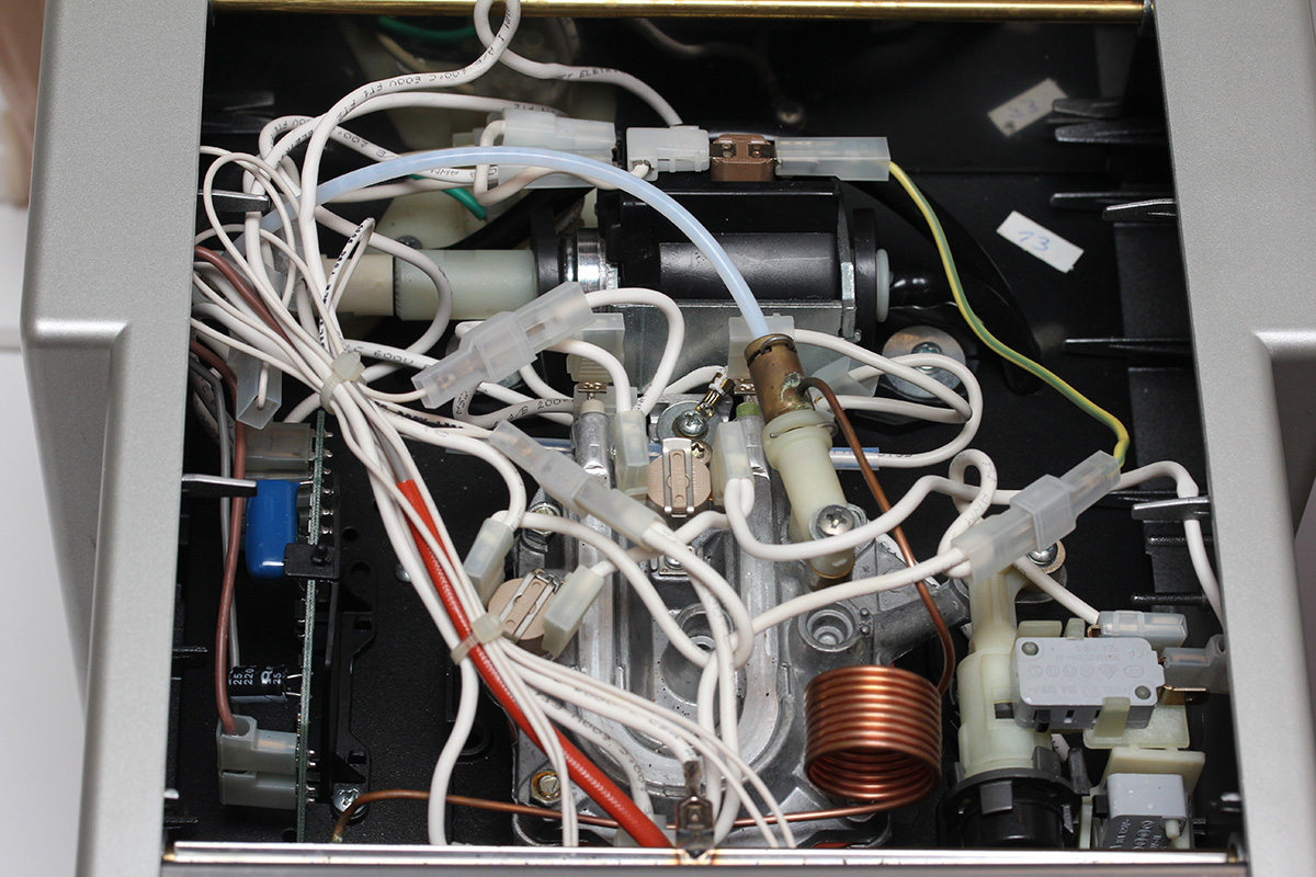 once i biked back to cambridge, i went about installing the thermal fuse back into the espresso machine. it was pretty straight forward, but i did have to look at an old photo of the wiring for reference. after adding some water to the tank, i plugged in the machine to test it out. after a few seconds, the second light turned on, indicating it was ready for espresso making. i used the infrared thermometer to read the temperature on the thermoblock, which went as high as 170°F before automatically dropping back down. so the thing didn't explode, and seemed to be maintaining a consistent temperature, so i call that a success.