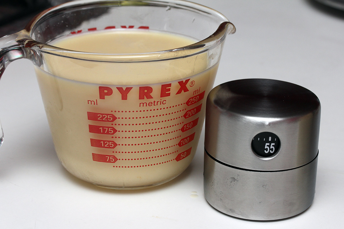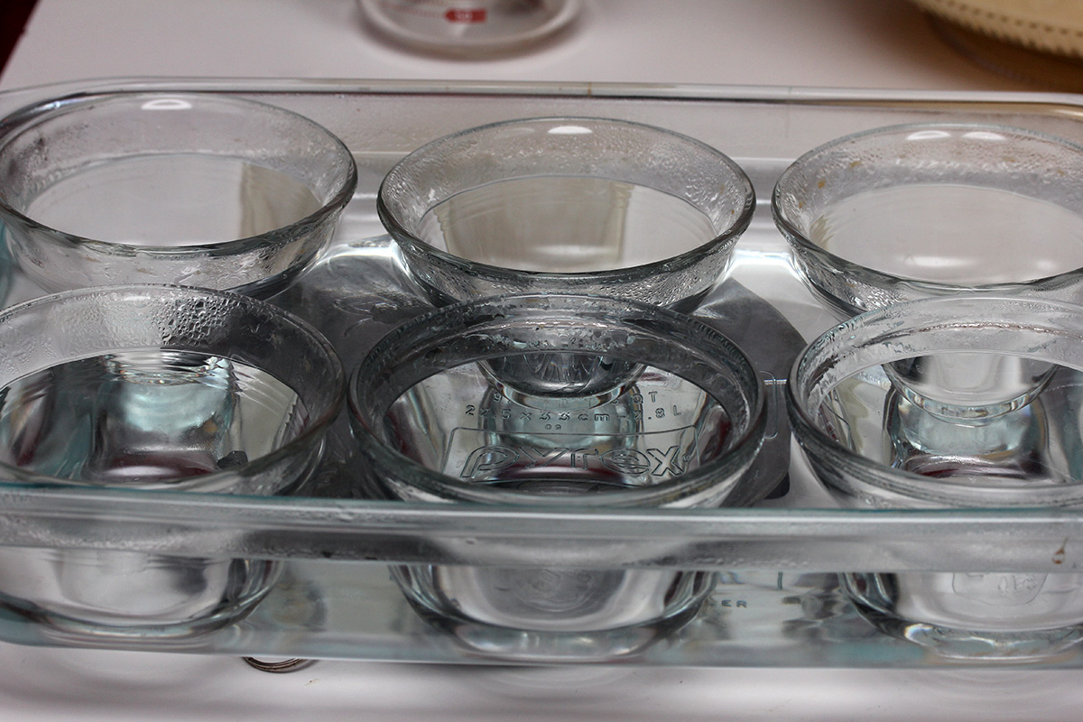 i'd be making 14 flan (6 for my sister's guests, 8 for myself), and i needed to scale the recipe which is set for 6 servings: 12 eggs, 8.4 cups of milk, 3.5 tsp of vanilla extract, 1.17 cups of sugar, 0.58 tsp of salt, and another 1.17 cups of sugar for the caramel. unfortunately i made a mistake in my math: i only needed 7 cups of milk, so i added 1.4 cups more than i needed.