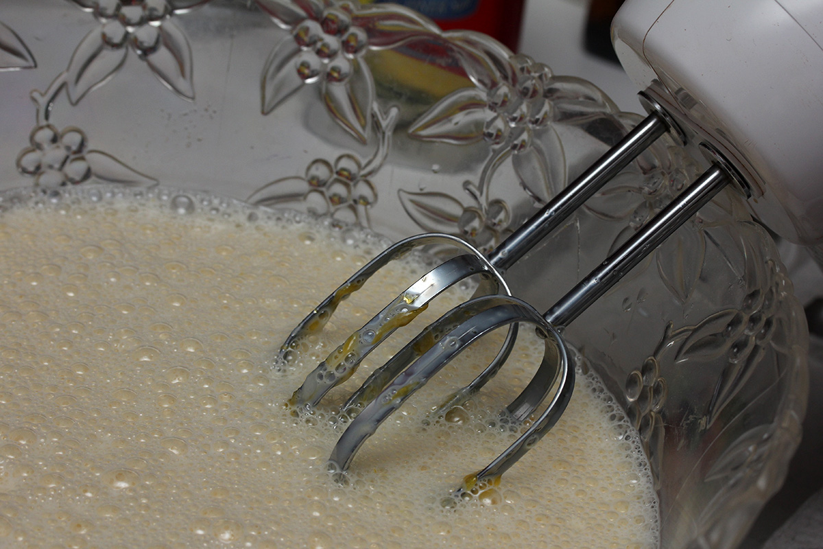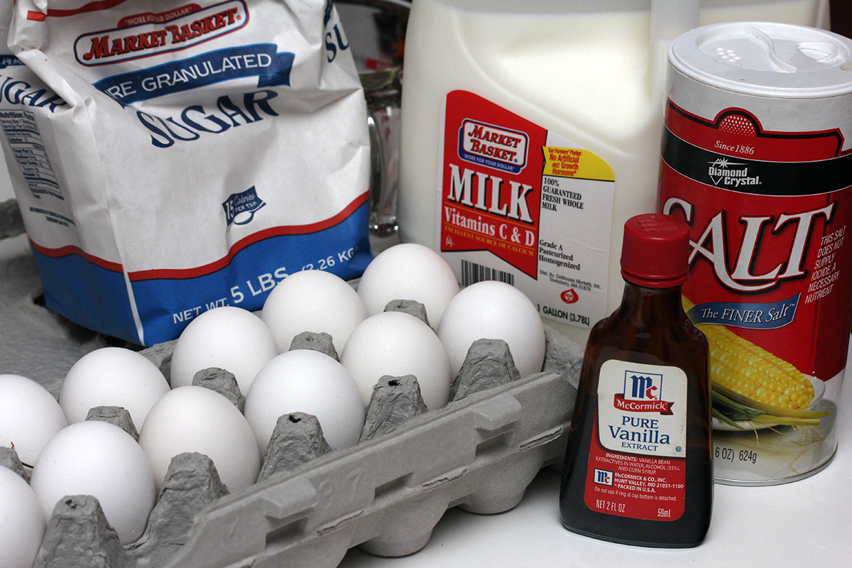 i did something different this time around: i mixed the eggs with the sugar and salt first, before adding the vanilla and milk. this allows the course texture of the sugar to completely break apart the eggs. usually when i mix everything together, i get little chunks of eggs still floating around; doing it this way ensures the eggs are popularly blended.