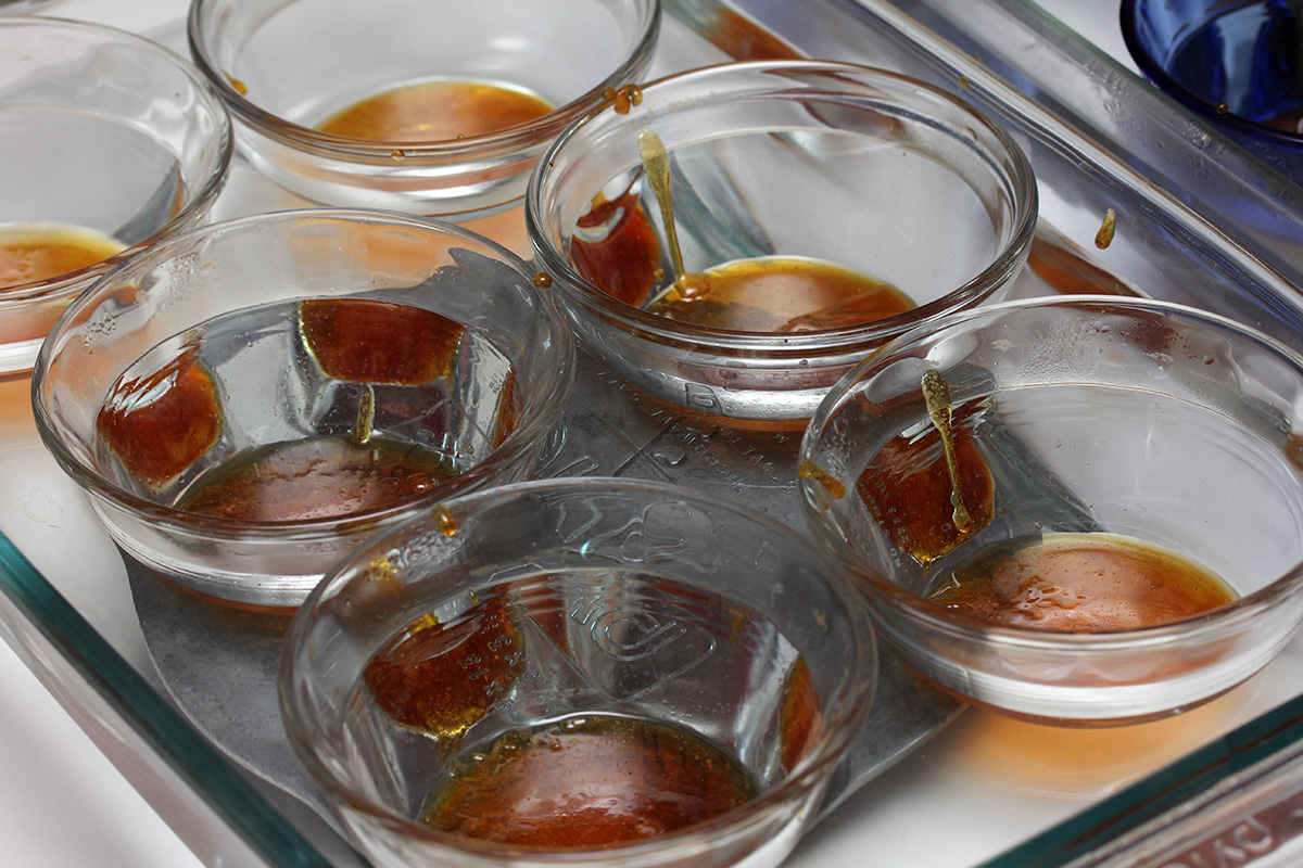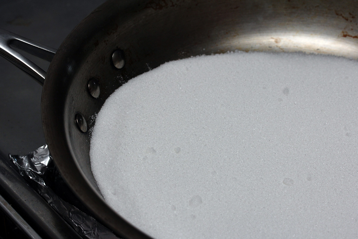 mixture blended, ramekins in their hot baths, it was time to make the caramel, half a cup of sugar at a time on medium heat. this is the most difficult part of the recipe, but i've done it enough that i knew what i was doing. i don't want to scorch the sugar, and when i pour the caramel into the ramekins i had to work fast, because it quickly solidifies. and put the pan back on the stove, i make sure to clean the caramel off of the lip where i poured otherwise it could drip to the outside of the pan and scorch that way.