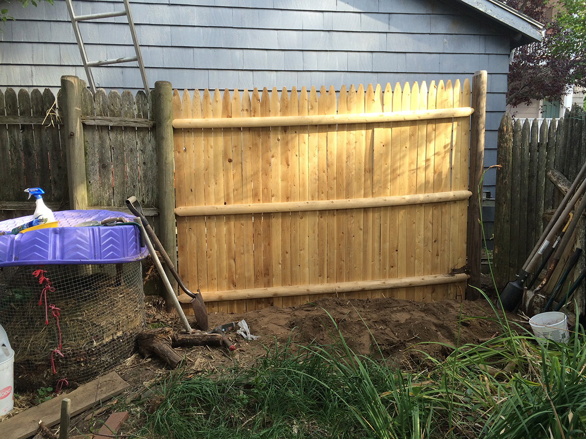 once the bamboos and some random tree roots were dug up, we could finally dig out trench and post hole. we didn't go down far enough because once we installed the fence and saw it from a distance, it's obvious that it's uneven. my father said it was good enough, but i told him if we were going to put in a new fence, we should do it right instead of just good enough. so maybe next week we'll pull out the post and reset the fence so it's more level.