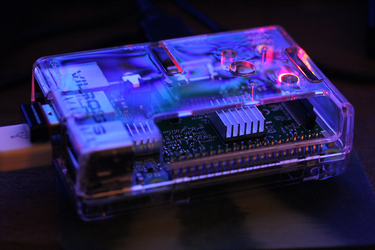 i pieced everything together in the kitchen (also so i can document the unboxing and assembly). i stuck the heat sinks to the chips, then put the board inside of the plastic casing. finally i inserted the 32GB memory card, preloaded with the raspbian OS. i dug out my wired mac keyboard and my usb wireless mouse, and connected the pi to my HDTV. i was worried maybe it wouldn't recognize my input devices (particularly the mouse) but everything worked effortlessly. first time booting, i was asked to install the system. i already input my wifi information, so beside raspbian, it also gave me the option of installing some additional OS's (pulled from the internet), so i decided to include OSMC as well, the open source media center. i waited as it took a little while to install everything. once it finished, it rebooted and gave me the option to choose which OS i wanted to start with, so i picked raspbian.