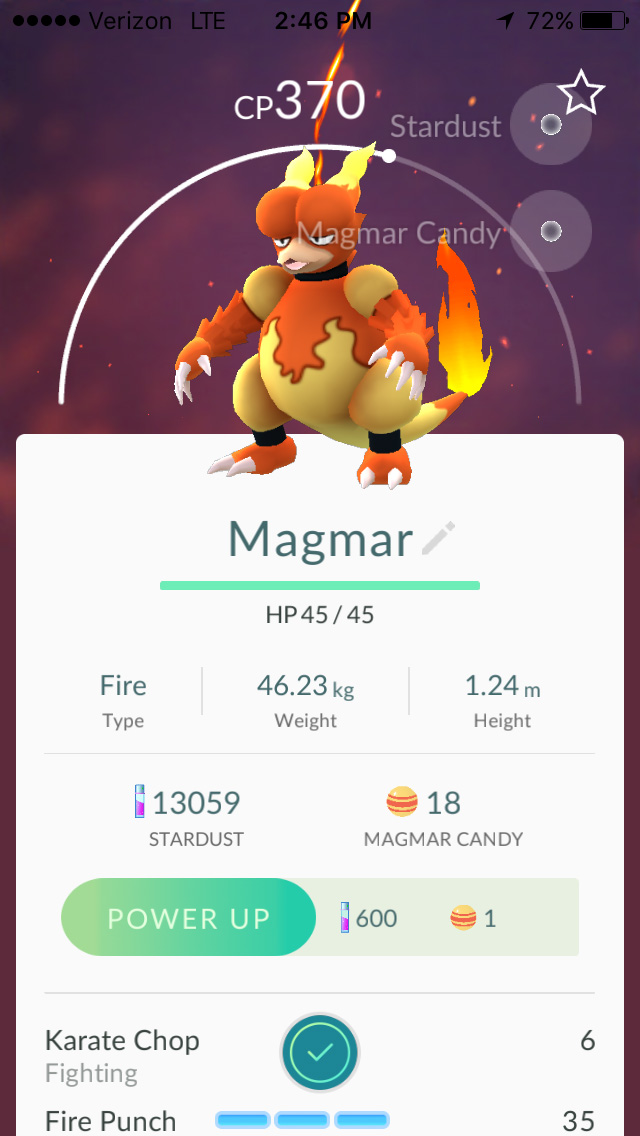 my 10k egg finally hatched, producing a magmar. it's not particularly strong, and even if i powered it up (maybe CP 700 maximum), it has a weak 6 point karate chop attack (not even fire, just a regular fighting attack). i'll sit on this one until i can get a better magmar, or use it against pokemons with fire-type weakness.