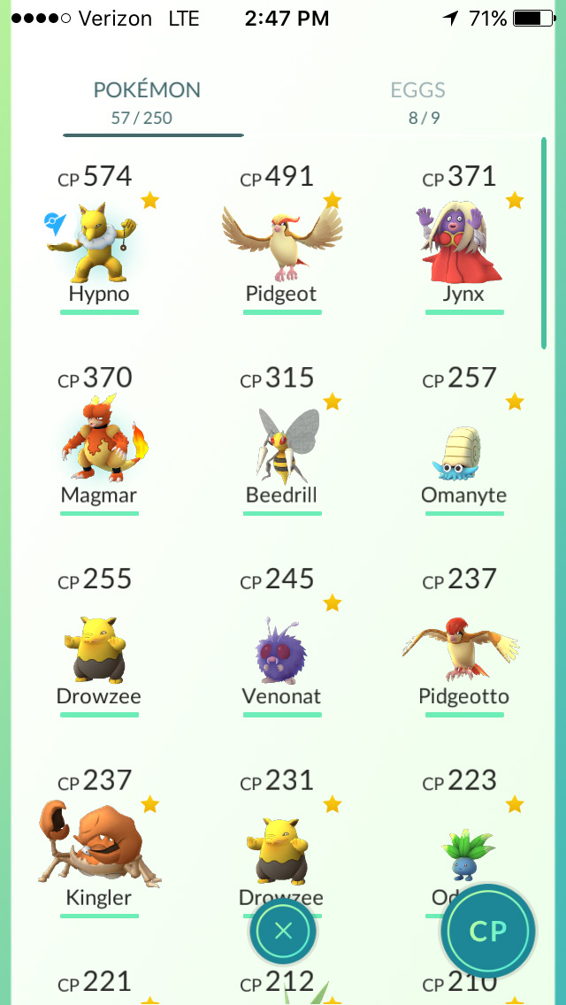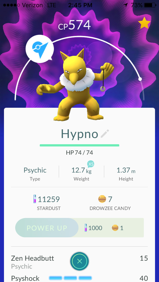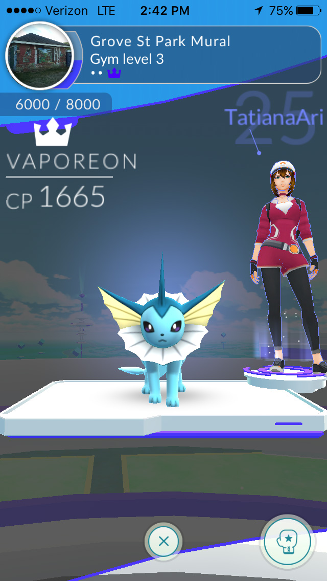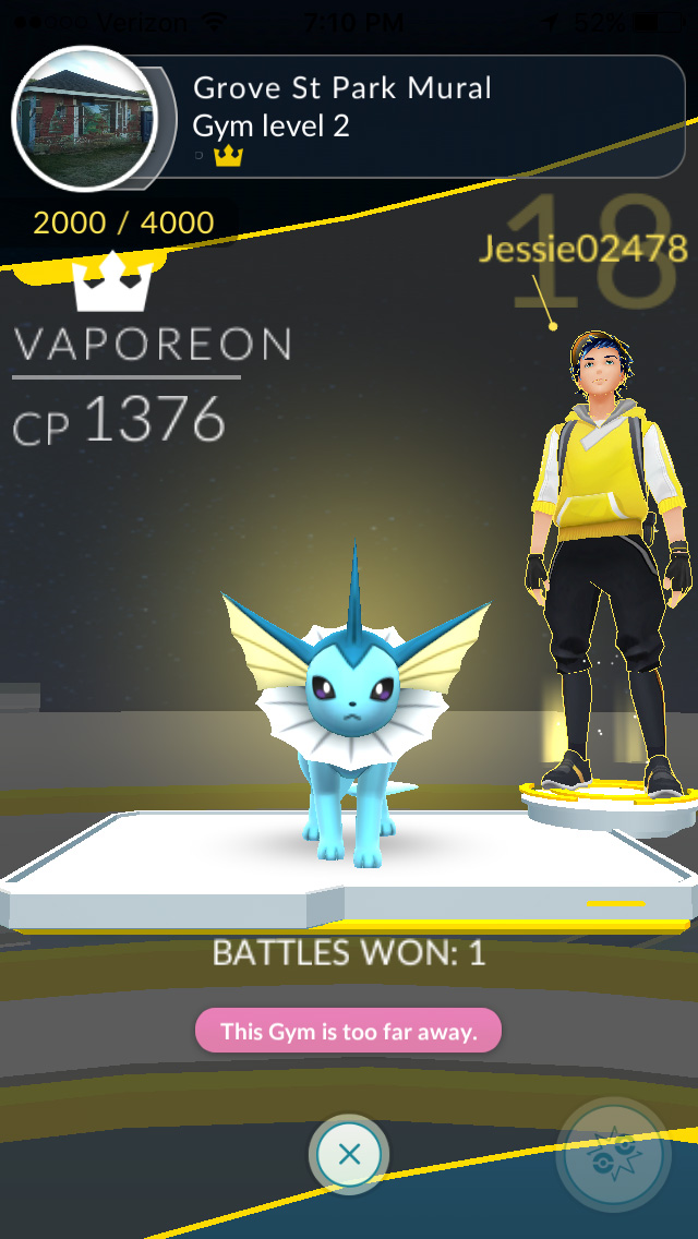 from my parents' house i could see a pokemon gym at the grove street playground. not only was it team mystic (my team) but it was a level 3 gym with an empty slot! i could join a gym without ever once battling anyone! this was an opportunity i couldn't pass up, so i went out to find this gym. i ran into my parents on street on their way home. "looking for pokemons?" they asked me as they drove by. i crossed the field to get close enough to the gym and added my best fighter, a CP 574 hypno that i evolved. i felt like a real poser standing shoulder-to-shoulder with level 24 and 25 trainers, with their CP 1500+ pokemons, which was 3x stronger than mine.