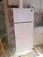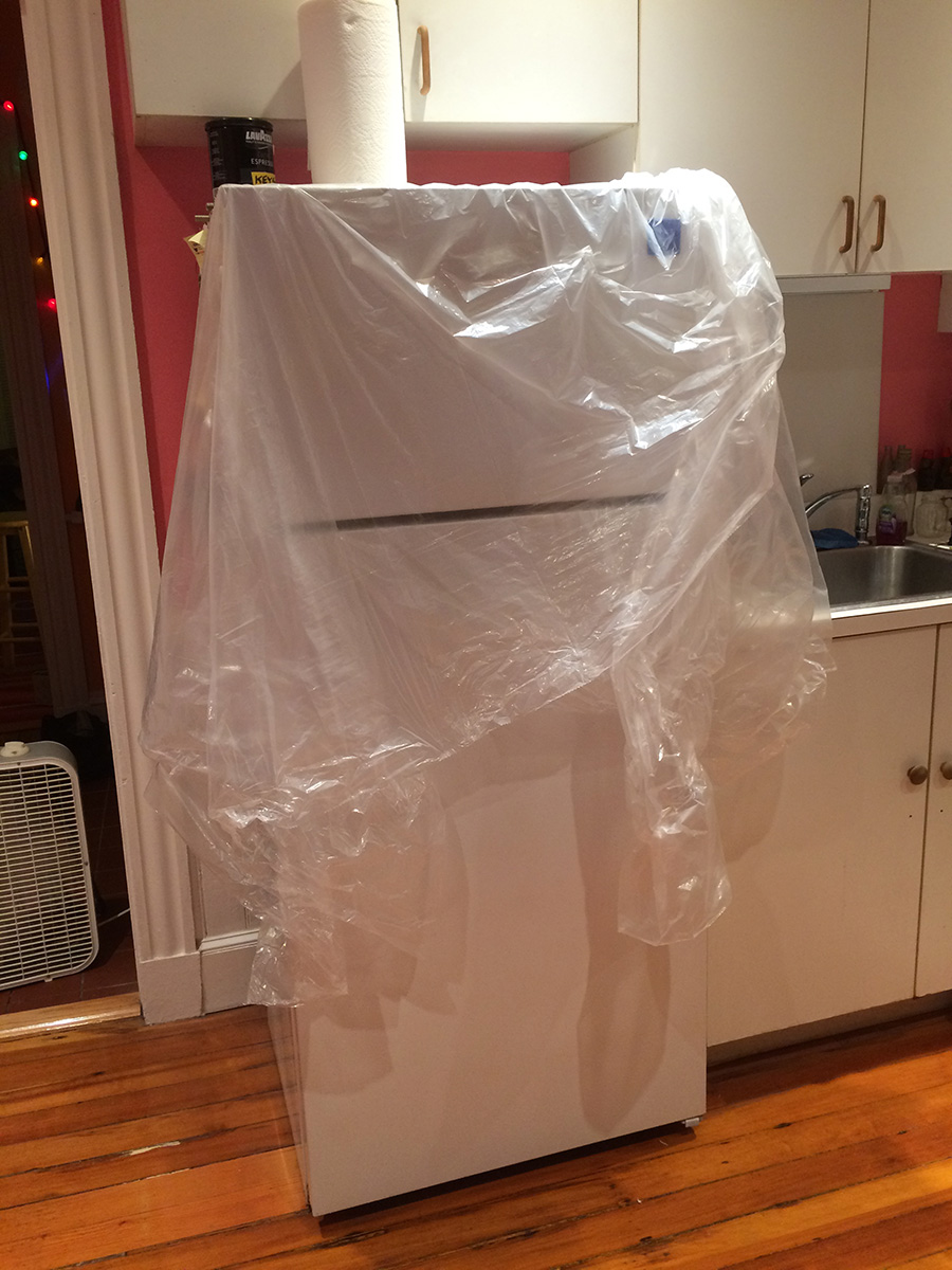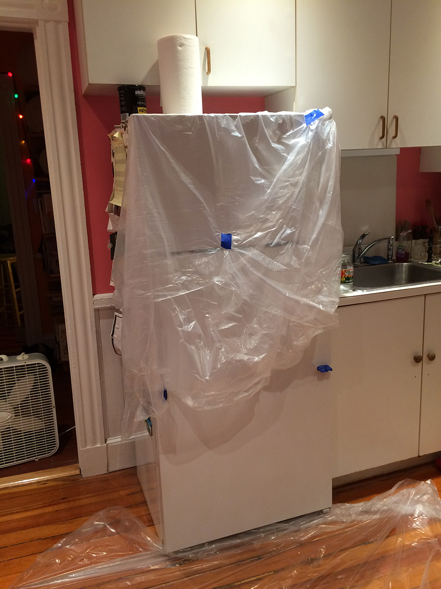 the idea i came up with was to wrap up the doors individually so they were in a pouch, and i'd spray into this tent. in theory it sounded fine, but in practice it was something else. tenting did manage to catch all the particulates, but working in such close proximity, i couldn't get a good distance to spray. also a few times the plastic tarp material touched the newly sprayed areas, sticking to them. i worked the freezer door then the fridge door, promising myself that this was the last coat, regardless of the outcome. it's an old fridge anyway, no need to spend so much effort fixing it up when i'll probably get rid of it within the next few years and get a better fridge that's energystar compliant.