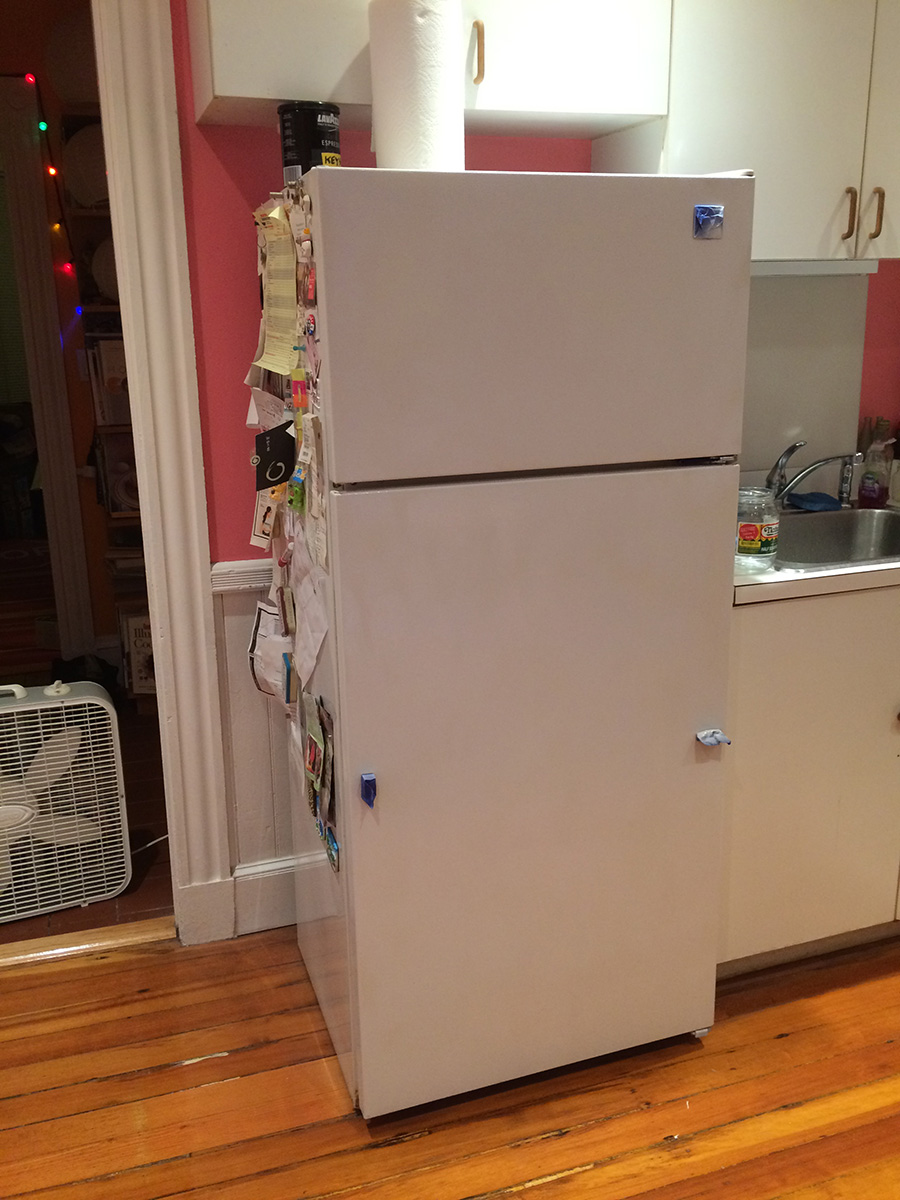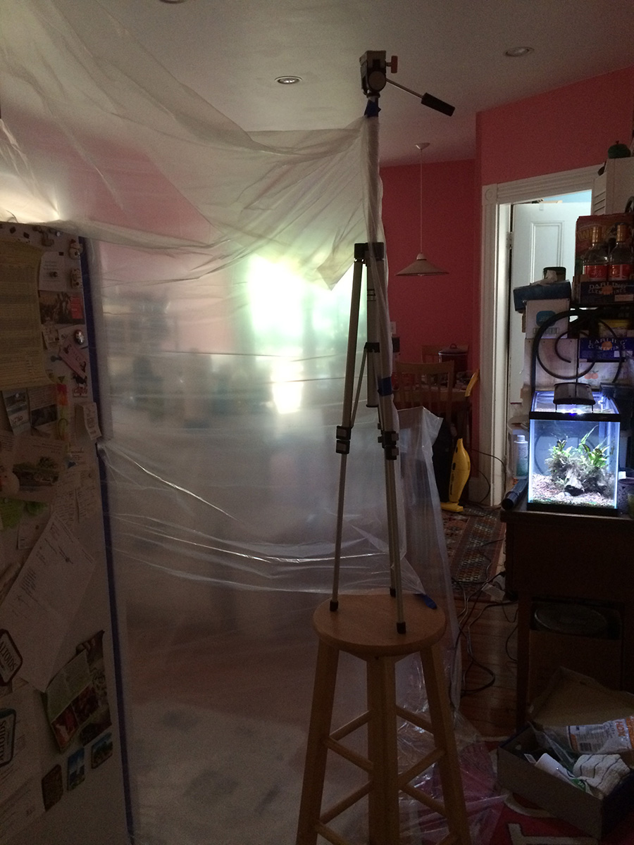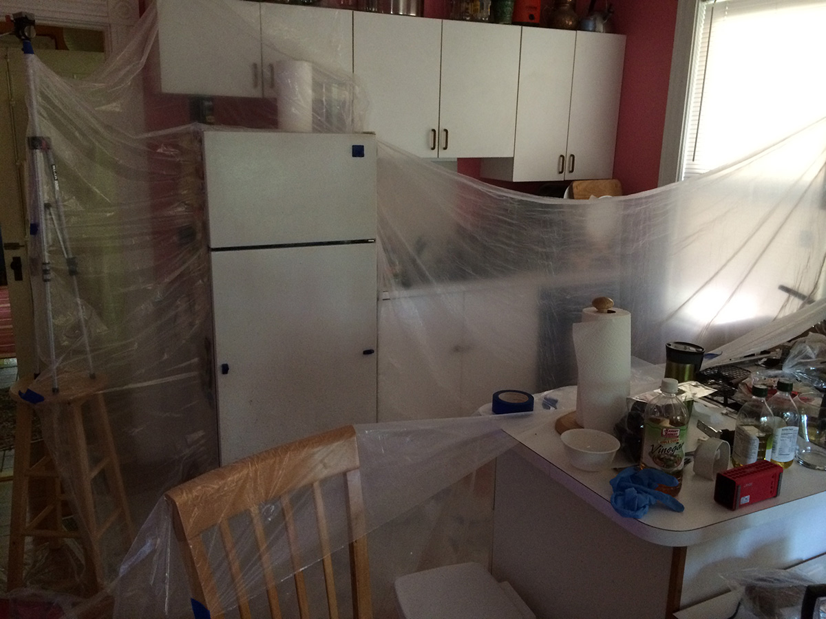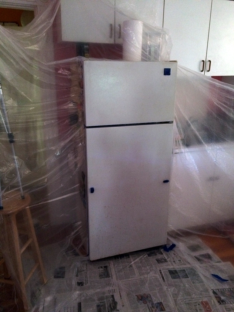 when the paint had dried to the touch after a few hours, i inspected the paint job. it was obvious that i didn't get good coverage, and there were still large areas where i didn't spray. maybe that wouldn't have been a problem, but per instructions, i actually gently sanded the fridge doors prior to spraying, so now any areas where i didn't spray had a matte finish versus the glossy finish of the sprayed regions. i would need to spray again to even everything out. but how would i do that without getting spray paint everywhere in the kitchen?