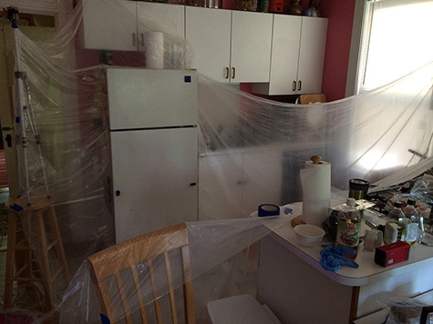 i patched a few more areas on the guest bedroom door, it should be ready for painting just as soon as the filler dries and i do one final round of sanding. i moved on to the next project, which is to repaint the refrigerator doors. i put down some newspaper and gave the doors a light sanding first. then i started putting down the plastic tarp.