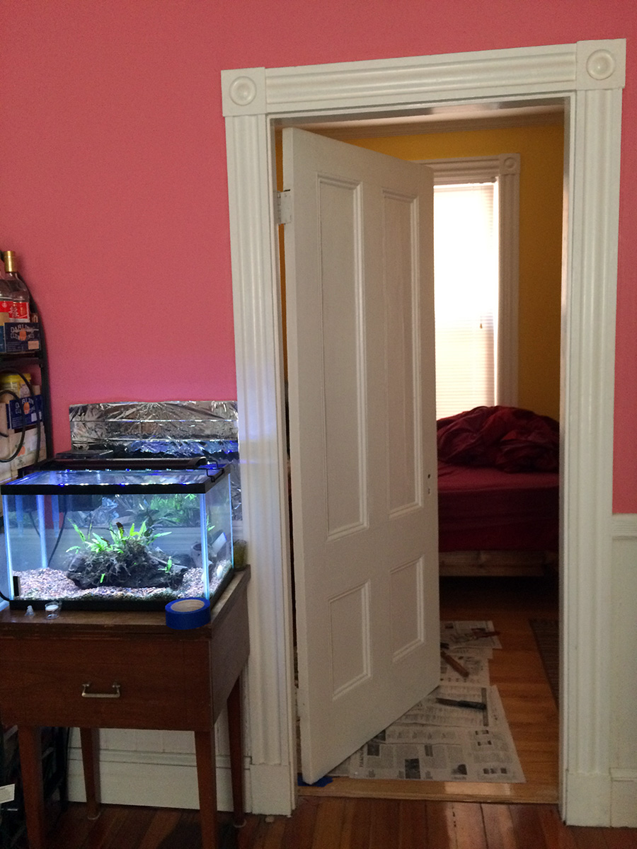 i returned home after dinner. with no more work on the guest bedroom door, i started cleaning up, throwing away the newspaper on the floor, and removing the few pieces of tape on the ground. now it's mostly superficial cleaning, like reorganizing the inside of the fridge and cabinets, and decluttering the kitchen and living room.