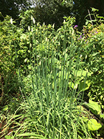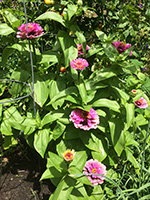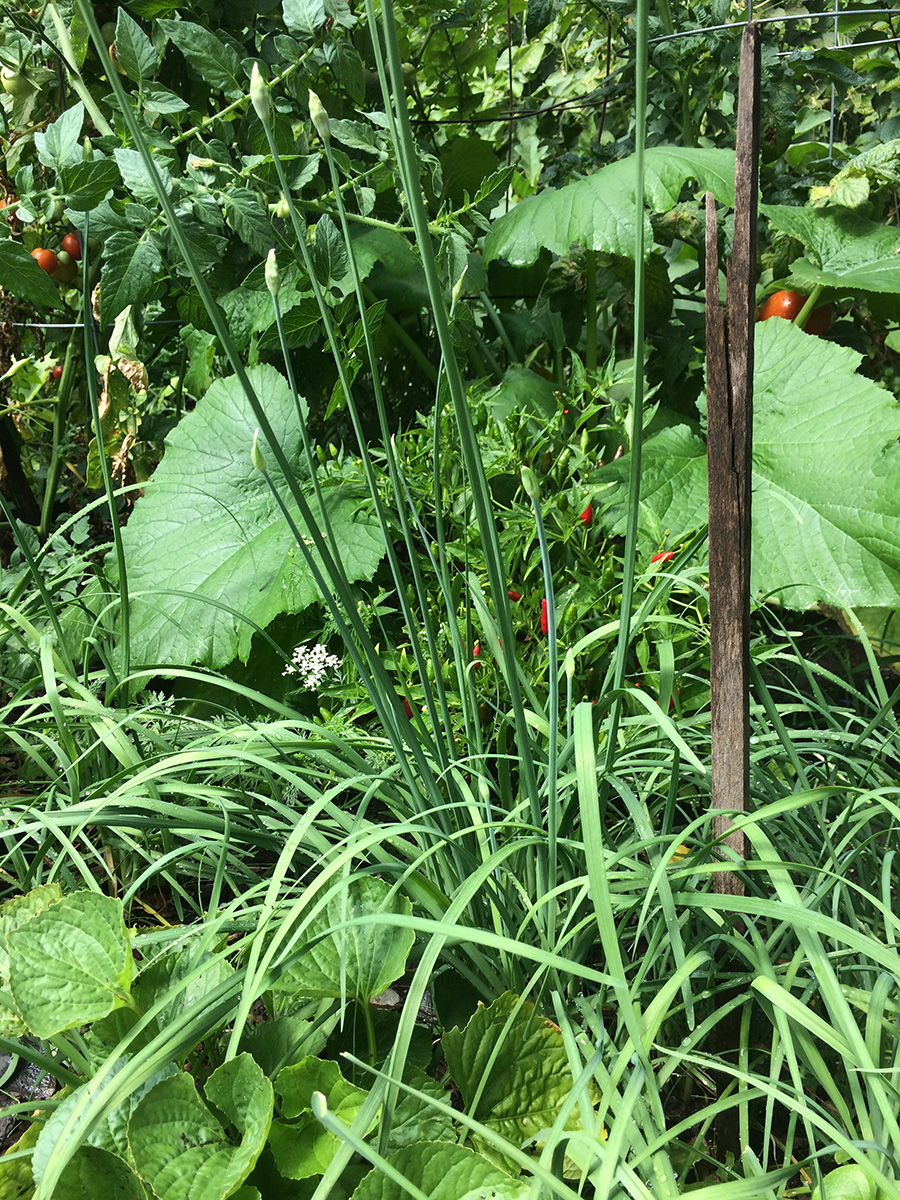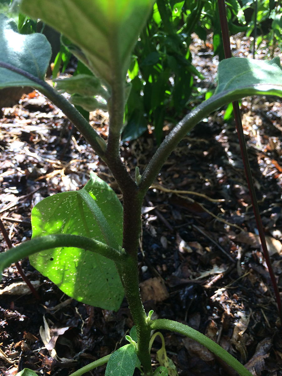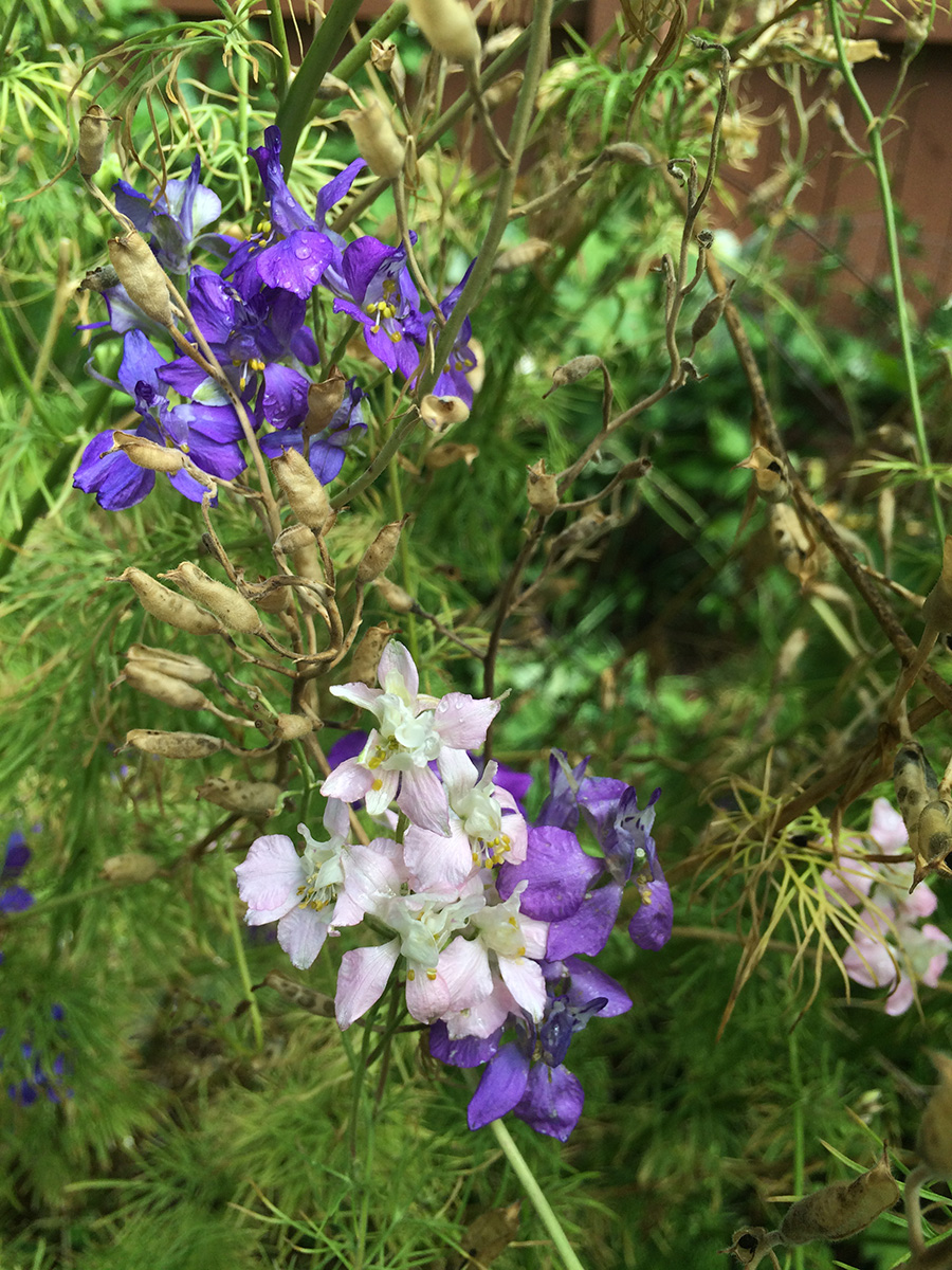 the hot weather is like steroids for the eggplants. they don't grow very tall, nor produce a lot of leaves, but i think they save all their energies for making eggplants, and i can't wait to harvest them, as i already see several flowers. the larkspurs have also started to blossom again; i think they weren't really dead to begin with (even though they produced so many seeds), all they needed was a steady drink of water to come back to life (at least some of the plants; others are actually dead). the garlic chives will soon flower as well, which will gave the bees something else to eat during the late summer early fall.