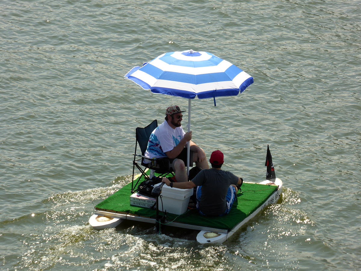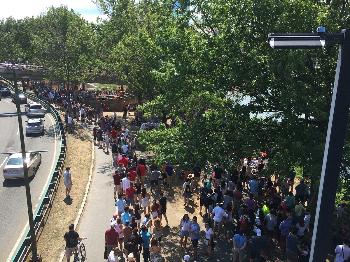 from across the river, the flugtag was actually hard to see. the only way i could see it was using the 30x zoom of my lumix digital camera. it wasn't all that exciting anyway, and after i saw one vehicle launch and then drop into the river, i figured i'd pretty much seen it all already. we tried making it into boston across the longfellow, by the further we got, the more crowded it became, until it was impossible to push the bikes through. in the end i threw the bikes over the barricade so we were back out onto the roadside bike lane, where there was no pedestrian traffic.