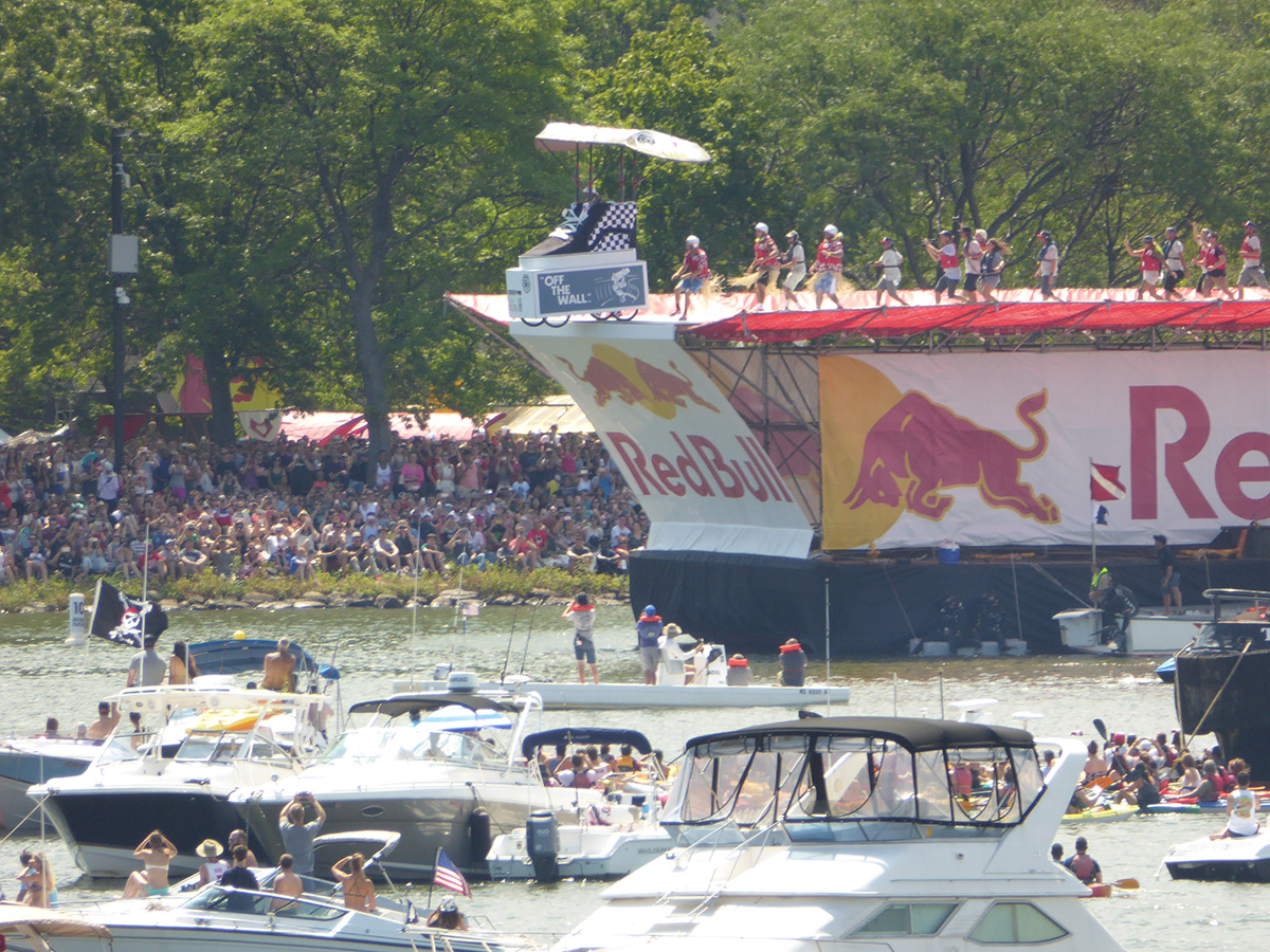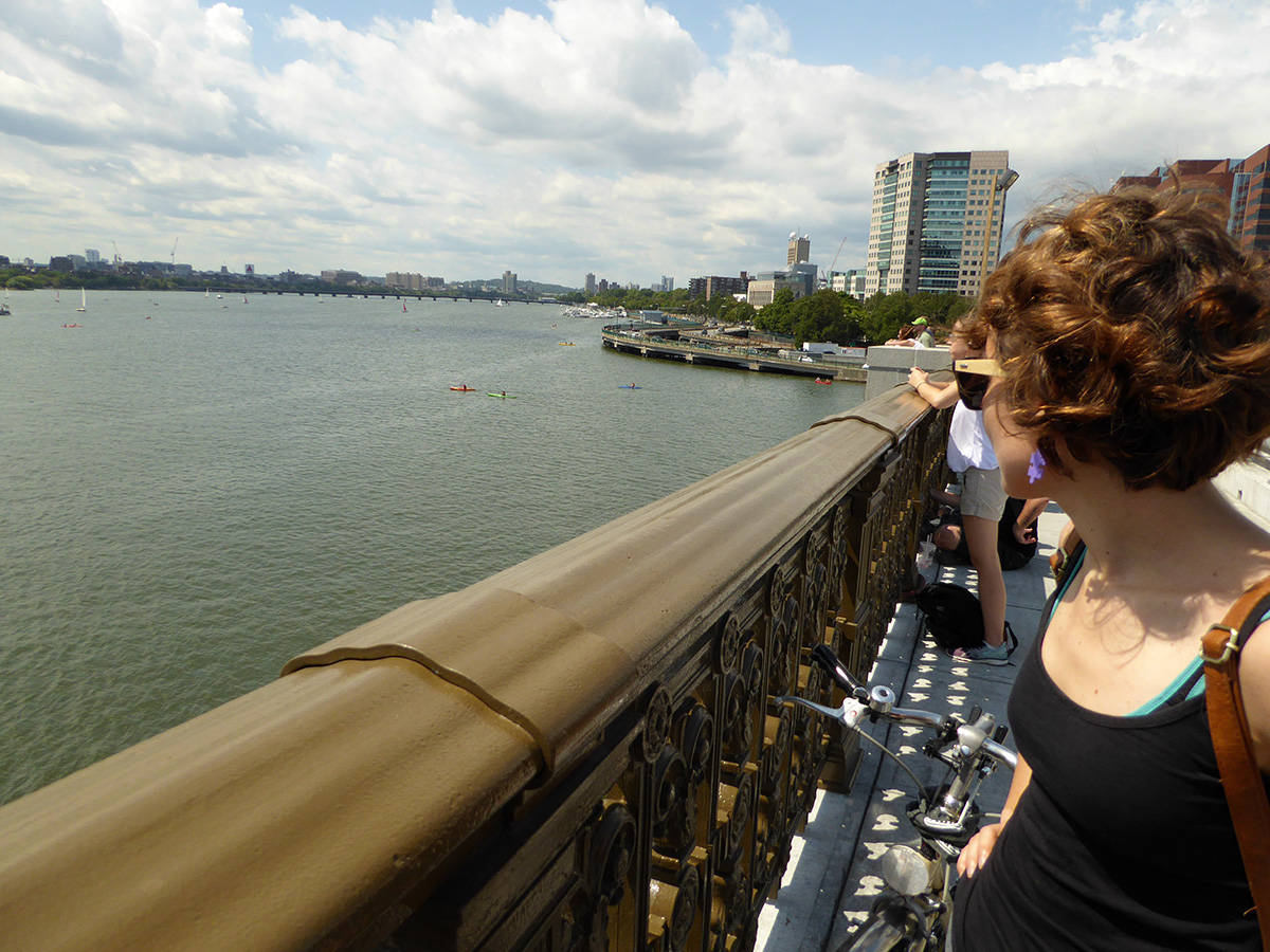 i invited cristina to come see the red bull flugtag with me on the charles. we were in no hurry to leave because the event lasted until 3pm, so we left close to noontime, when the flugtag had already begun around 11am. i had a feeling it was going to be crowded, and even in the website it warned people to arrive early. my plan was to see the event from the opposite side of the charles river, riding past by MIT along the way (which cristina hadn't seen yet). i wasn't the only one with that idea, and as we got closer to the longfellow bridge, we began to encounter ever increasing amount of people.