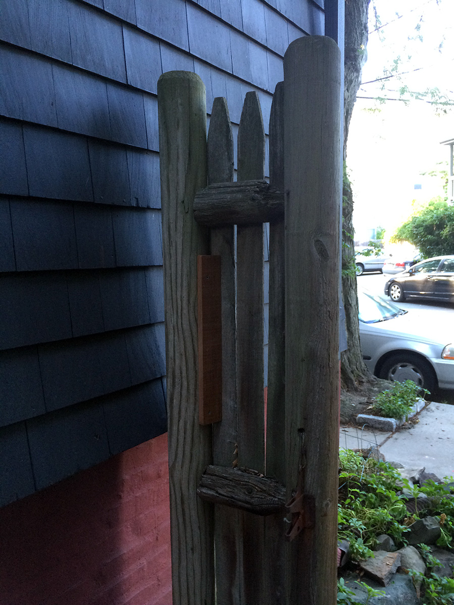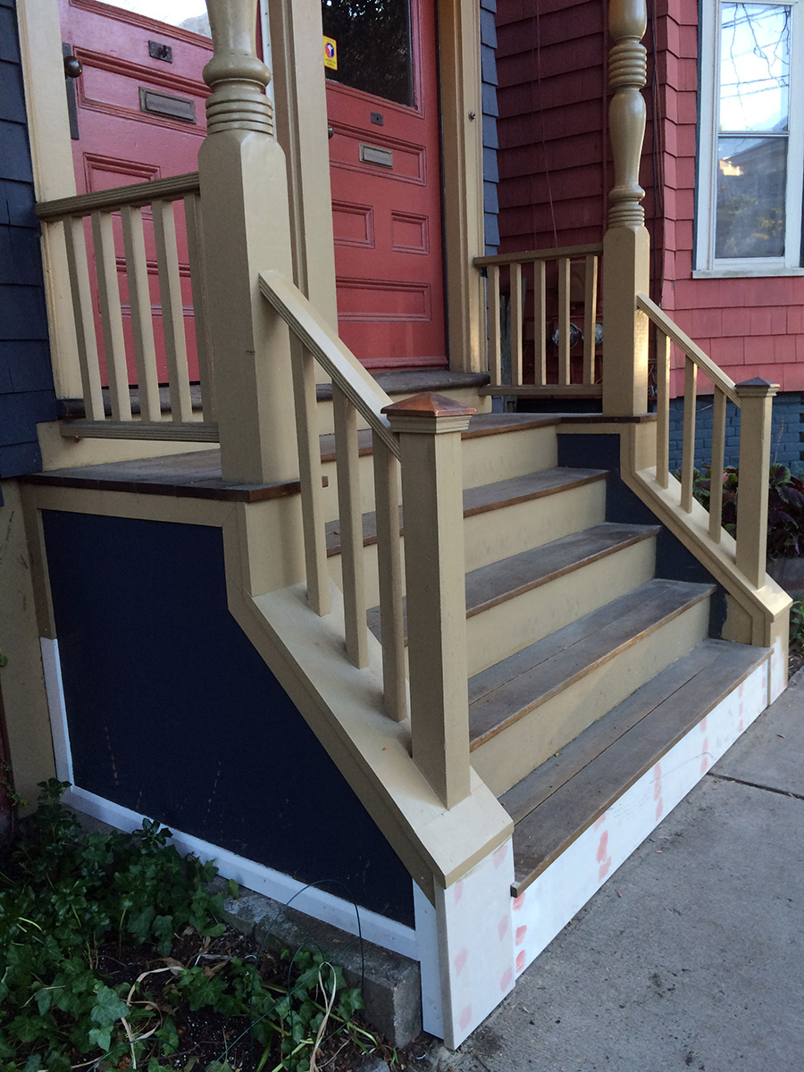 when john carpenter finally left by 6pm, only then did i take a peek outside to see the work he done on the front porch. it's okay, apparently he had some biege paint which he used to prime some of the bare wood, but also accidentally painting over some blue slate areas. on the left side of the stairs one of the wooden panel is not completely flush. i did notice he worked on our side gate yesterday, nailing a piece of wood to the post to keep it front falling apart. i wonder if that was a freebie?