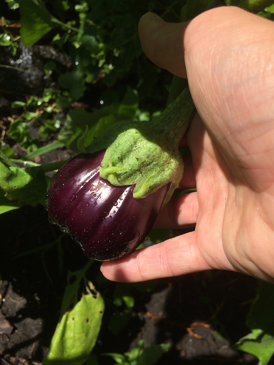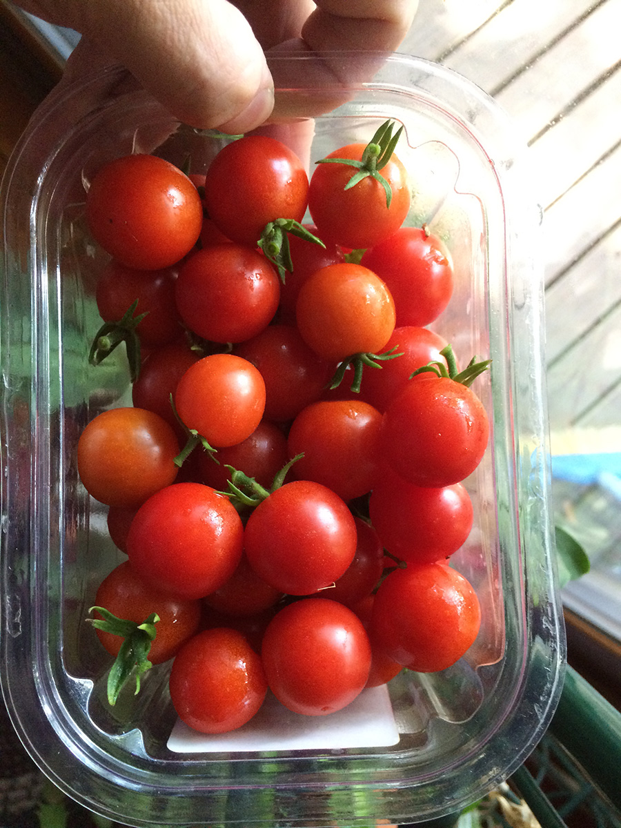 i gone the whole weekend without visiting the community garden and since there was no rain, i was due for a visit. instead of going home, i made a detour via the motorcycle. my eggplants are developing, but they have a weird shape with vertical ridges, not the smooth skin i'm used to with eggplants. maybe they'll fill out once they fully mature. i also collected a container of cherry tomatoes with a sprinkle of thai chili peppers.