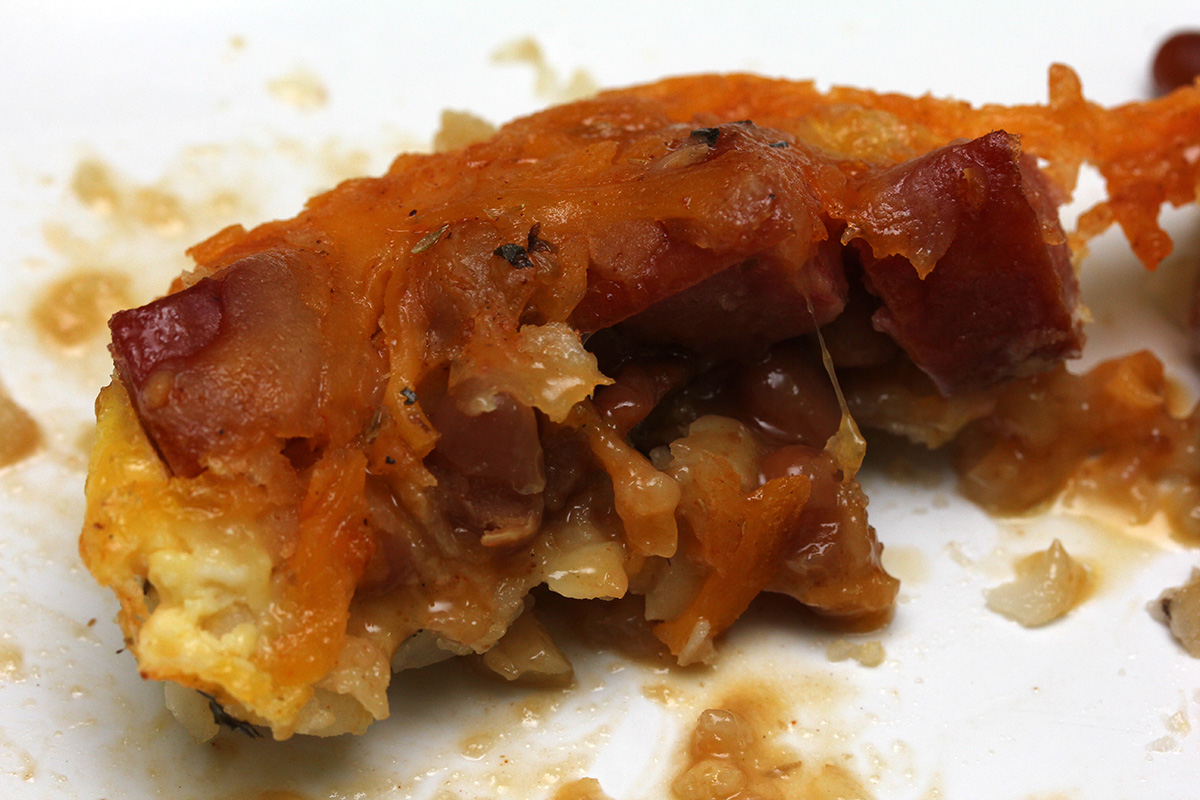 as for the taste, the beans added a sweetness, while the kielbasa and cheese the saltiness. the hash browns unfortunately tasted a bit of soggy. tips for next time: grease the muffin trays, get better quality hash browns, and maybe change of the ingredients. i didn't care much for the beans and the kielbasa was a bit overpowering. i shouldn't have used mexican cheese either, it shifted everything a bit tex-mex. i ended up eating 6 cups, which was the equivalent of a big breakfast.