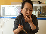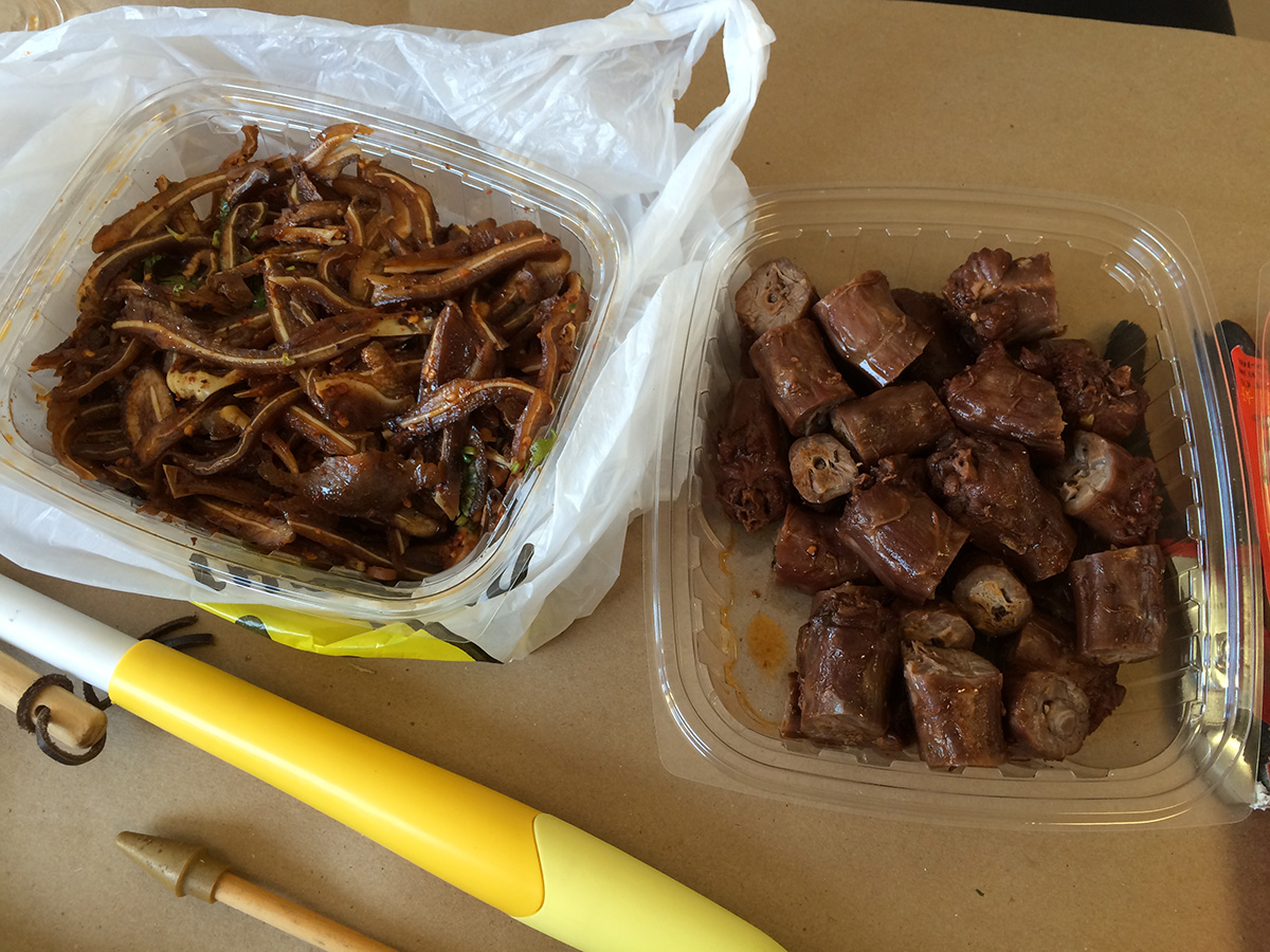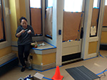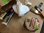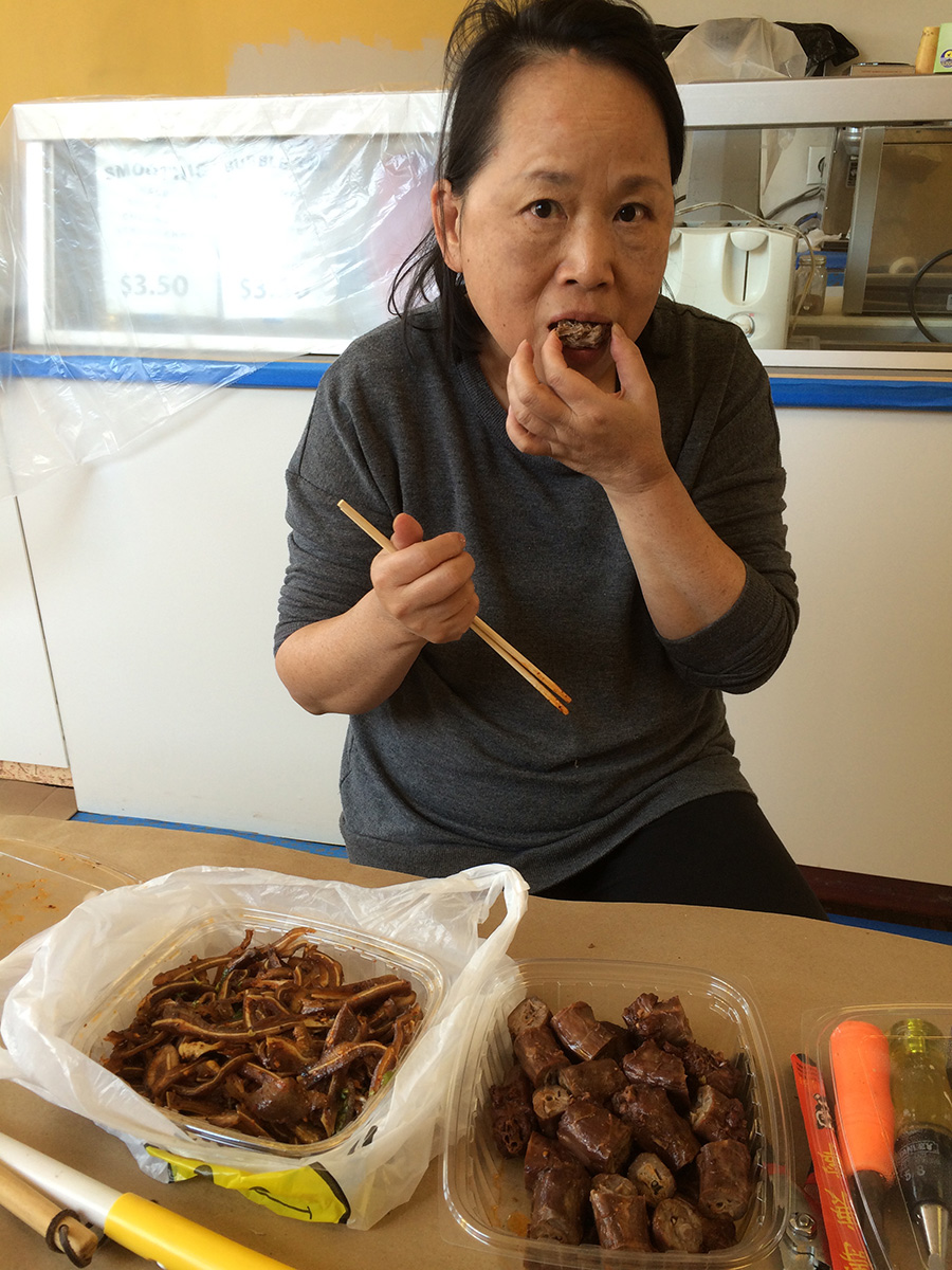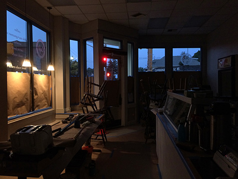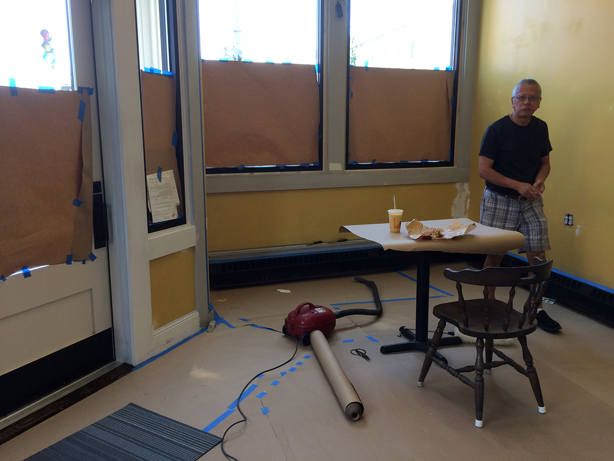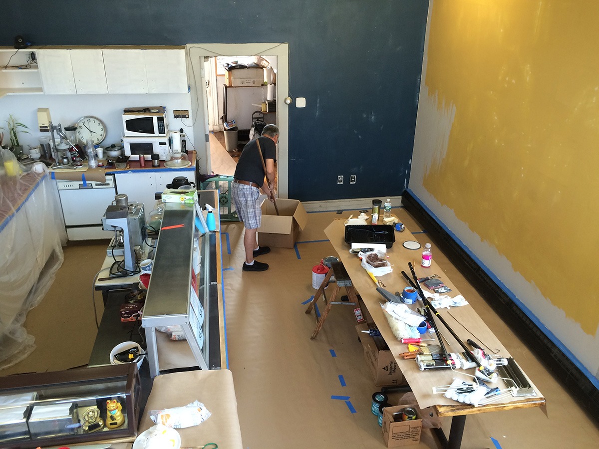 at noontime we stopped for a food break, my father going to the nearby burger king to pick up some whoppers. only after we ate did we finally begin painting around 1pm. i started with the edges before my father joined in as well. feeling left out, my mother did a little bit of edge work too. casey and her husband showed up briefly around 3:30pm to deliver some pig ears and duck necks. she told my parents they opened up a new noodles restaurant in quincy. while my parents were chatting, i continued with the painting. after our guests left, we finally got to rolling a bit before 4pm. we finished putting the first coat on the wall at 5:30pm. we decided not to do anymore painting but instead begin moving some appliances back into the cafe, as rain was expected later tonight and all of tomorrow (from tropical storm hermine).