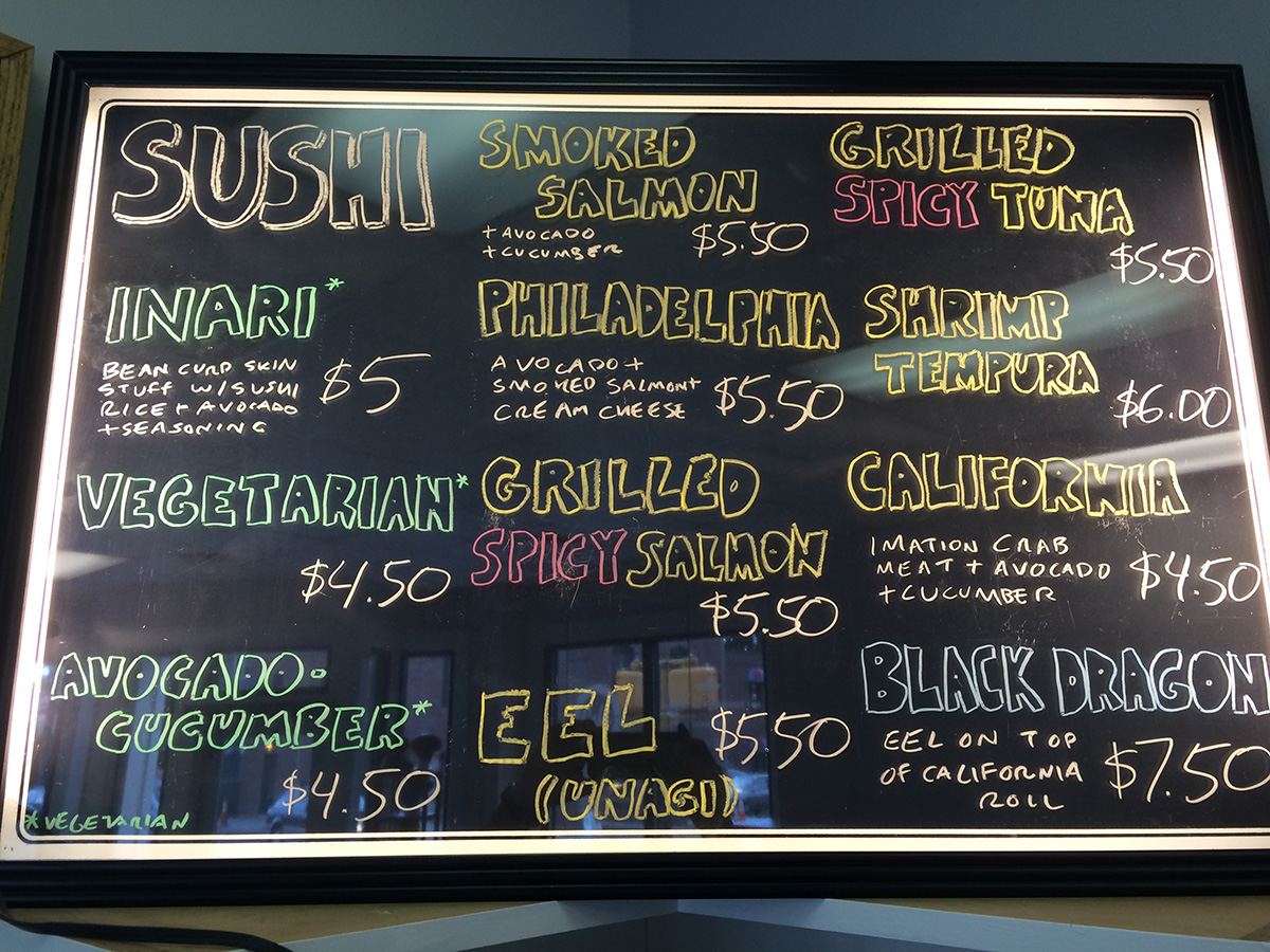 back when the sign was vertical and hung lower to the ground, it was easy to read with regular writing. but now suspended nearly overhead, i needed a "font" that can stand out more. i ended up going with an outline text, almost like graffiti writing. the sushi menu has been reduced to 11 items, which allowed me to create a dozen grid (one for the "sushi" title). it came out much better than i expected, which really surprised me. i didn't even have the problem i normally do when i write signs, which is my writing gets progressively smaller, or the margin begins to slant (i did run into that problem with the "sushi" title; ended up doing it twice more before i got it to the way i liked).