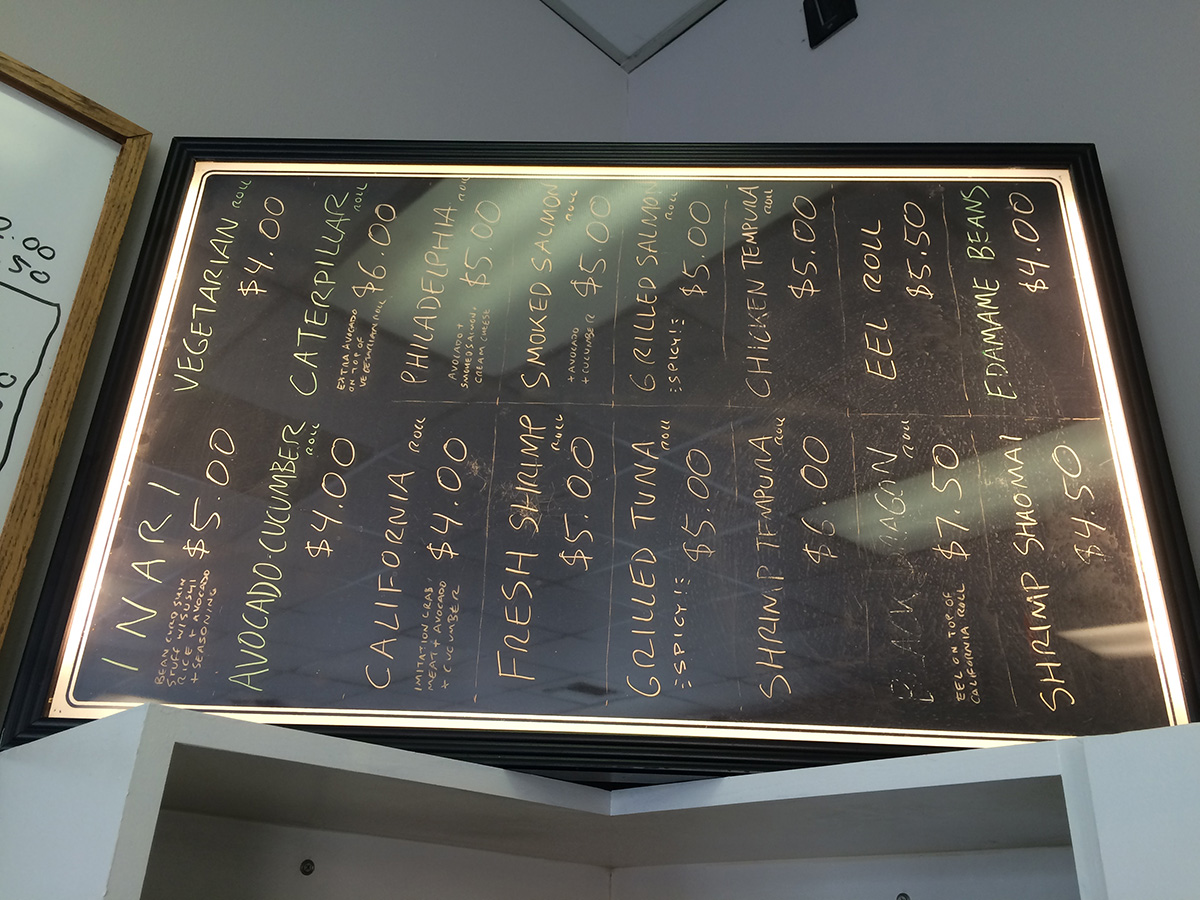 the illuminated sushi sign used to hang vertically, but my sister told my parents to hang it horizontally from the wall. i thought it was a terrible idea and fought it all the way, until my father put it on top of the cabinet and it fit in the corner perfectly. as for the sign itself, i wrote the original sign. originally it had just 4 items, but in 2012 they expanded their sushi menu to 16 items.