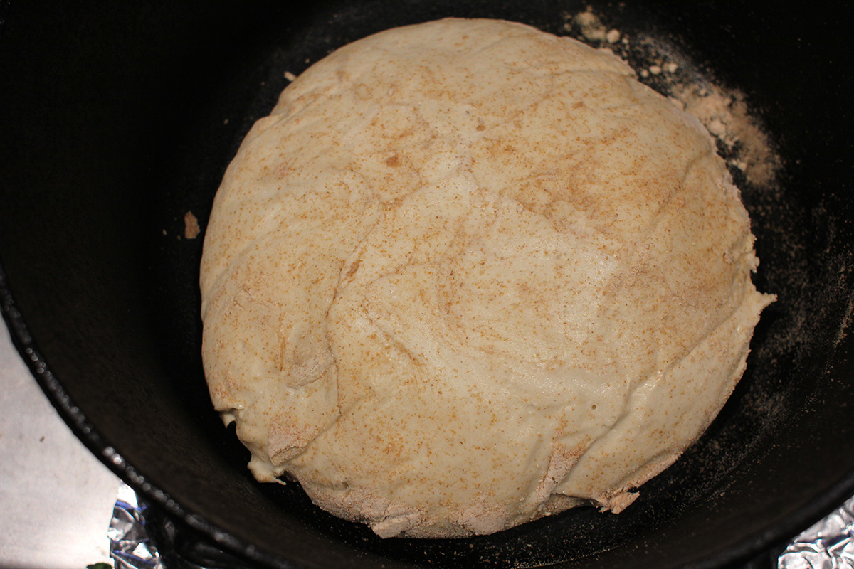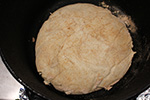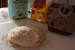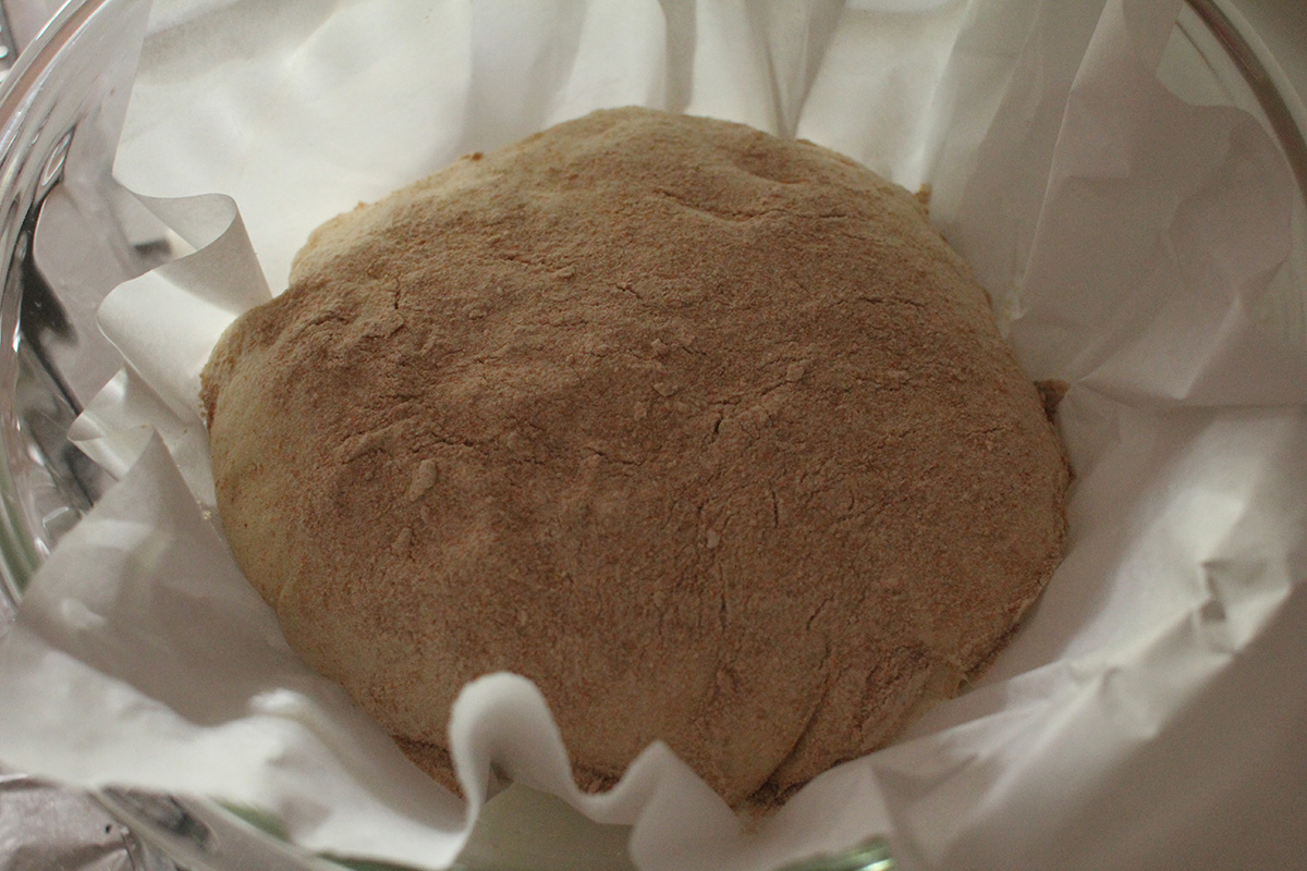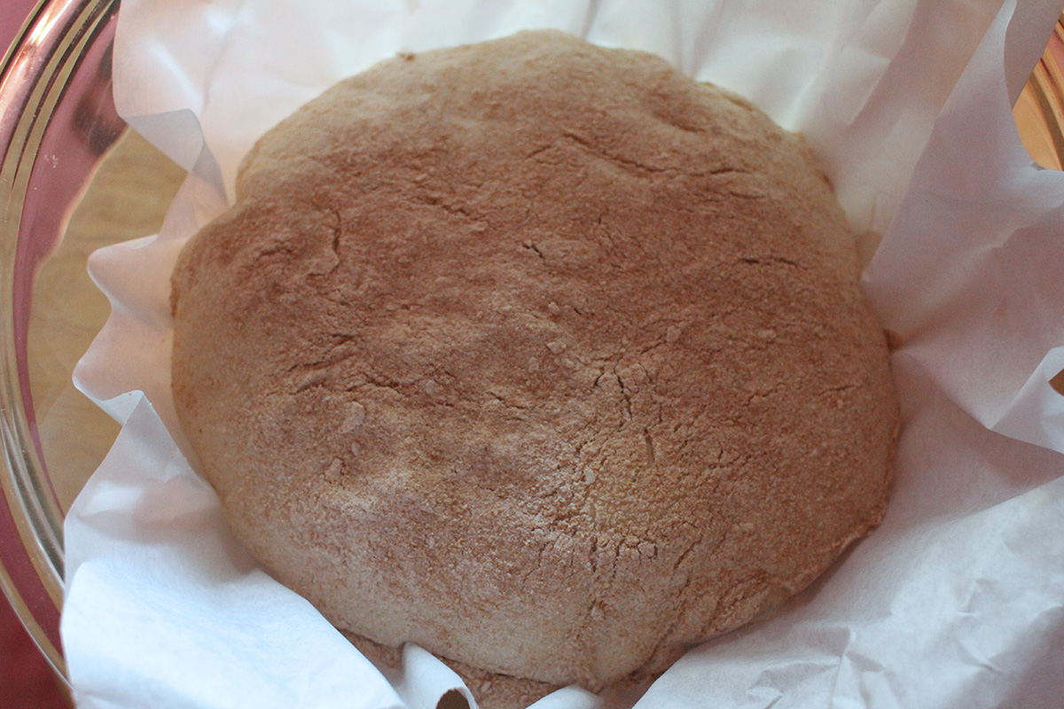 learning from yesterday's mistake, i made sure to use a lot of flour to keep the dough from sticking, both on the board surface and on the dough itself. i managed to get a really good fold, transforming the dough to a tight ball. instead of putting the dough on cheesecloth - which the dough has a tendency to stick to - i put it on a piece of parchment paper before letting it rest in a medium pyrex bowl.