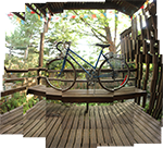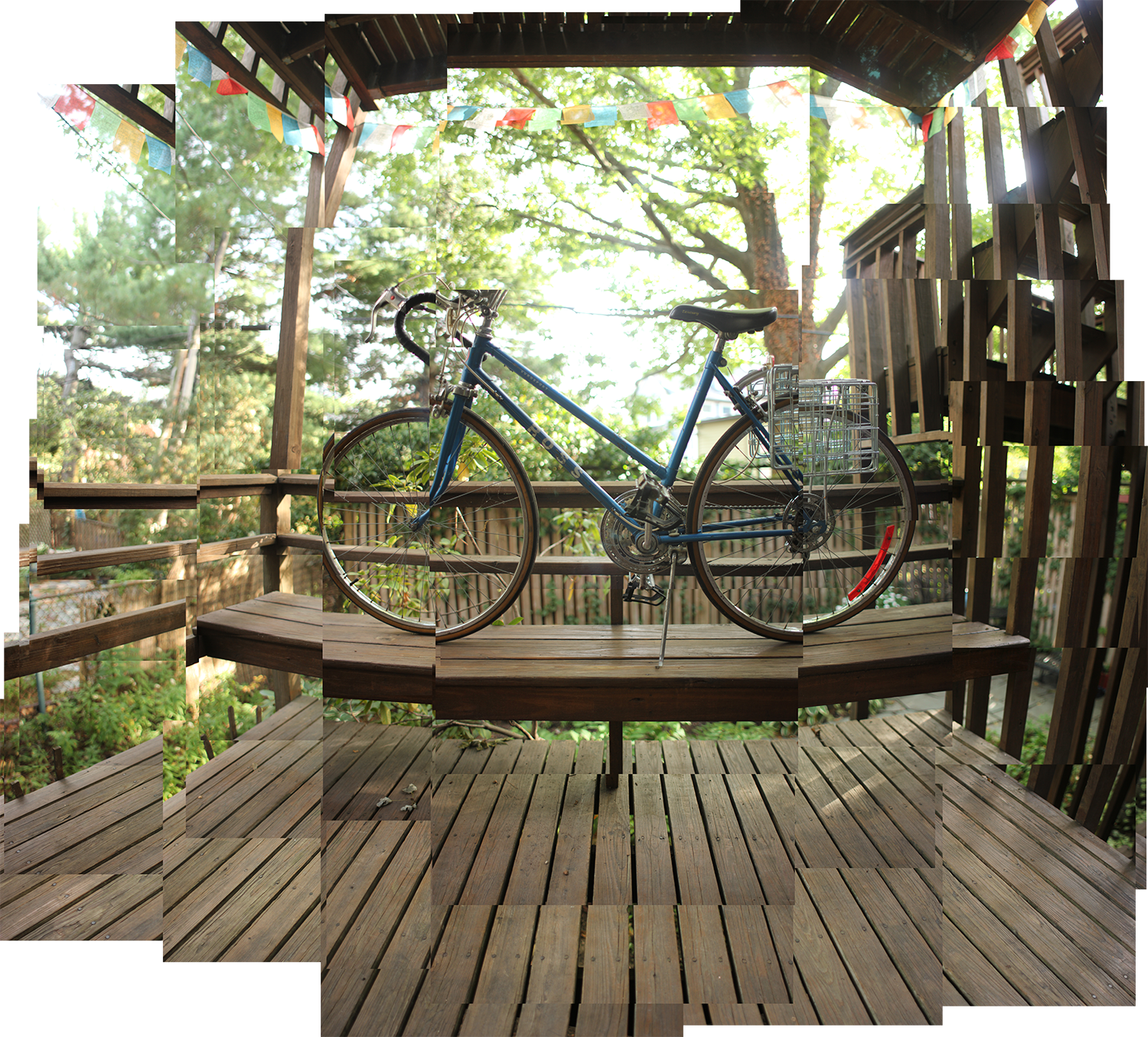 my final attempt was to use the 11 remainder photos and do a photomerge with them. the result was better but it still messed up the front wheel and cropped out a letter from the "ross" on the frame.