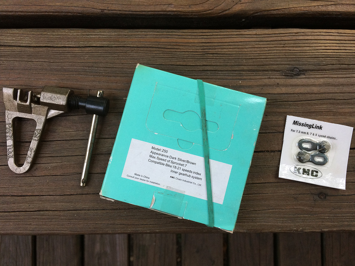 i've replaced enough bike chains at this point that it's pretty routine, and one of the easier repairs to make on a bike. i used a missing link segment to attach the chain together in case if i ever wanted to easily take off the chain (for cleaning or repair). the hardest part is making sure the chain is of the correct length, and i did that by using the old chain as a measure. the old chain wasn't in too bad a shape despite rusting shut: there was hardly any lengthening when i laid it parallel with the new chain (compared that with my trek utility bike chain when i replaced it back in july, the old chain had lengthened to nearly a full link of extra slack).