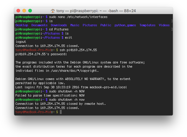 later in the evening after cristina went to sleep, i continued playing around with the pi zero. earlier i tried running it off of a portable battery but because it was headless i couldn't tell if it was actually running and because the wifi still didn't work, i could remotely access the pi either. i did find a way to attach the pi zero to my computer using the OTG cable, using a process that mounts the drive using ethernet over the USB. it was easy to modify (just tweaking the config.txt and cmdline.txt) but took several tries to boot up successfully. i knew the pi zero was running and everything was working because i was suddenly able to ping to pi@raspberrypi.local then gain access via ssh (i did have to modify the known_hosts file because raspbian detected a change in the remote host credentials - this happened because i ssh'ed to the pi 3 prior to the pi zero).