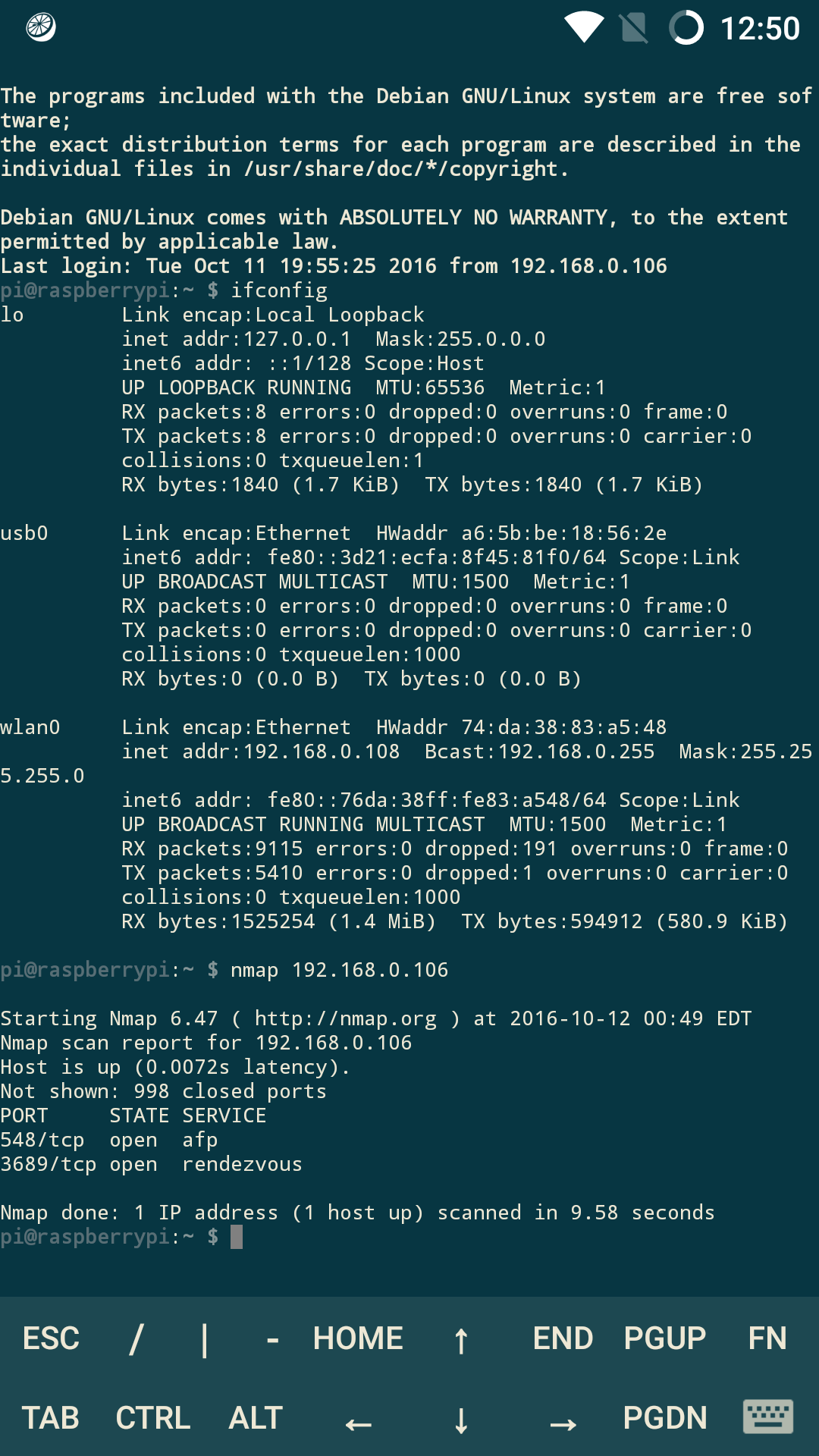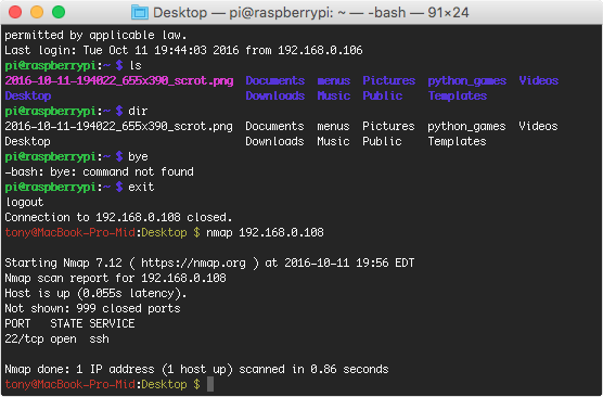 i plugged in the newly encased pi zero in the evening to install wavemon so i could monitor its wifi activities. since i've been able to connect to my own wifi router, i figured at the very least i'd need to connect the public xfinity router. but the pi said it was connected so i tried apt-get and it managed to download and install wavemon without any problems. could my wifi be working now? i opened the chromium browser and pointed it to google.com. it managed to load the page after a short while, the slow speed was to be expected. i then went to my macbook and nmap the pi zero's ip address: to my surprise it found it just fine, told me the ssh port was open. this has never worked before! and now it was working! i was then able to ssh to the pi zero without any problems, and secure copy (scp) a file from the pi to my macbook.