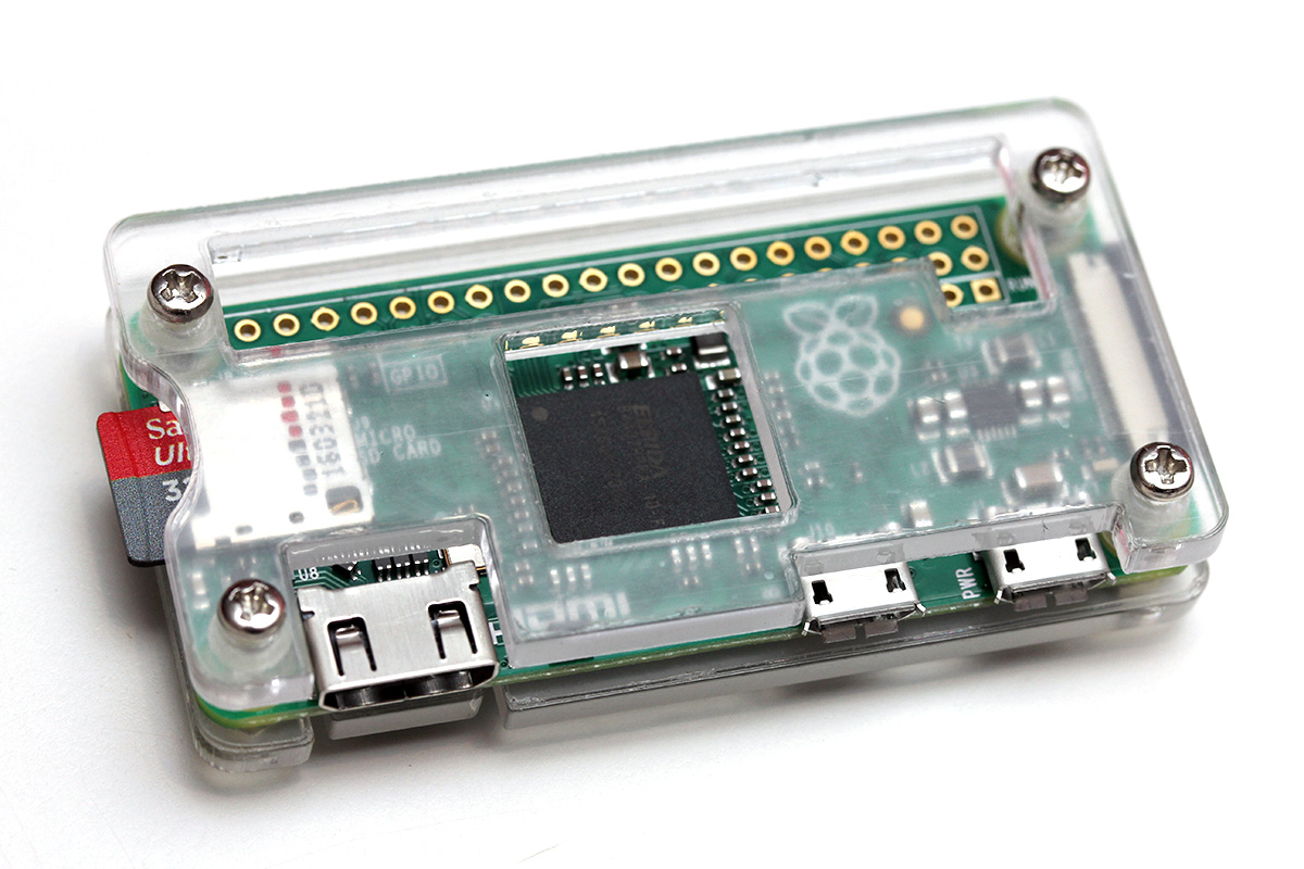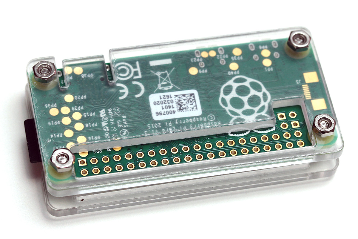 my raspberry pi zero case arrived. i forgot i'd ordered 2 (ebay purchase, 9/29, from shenzhen, $2.07 each). it's a simple case, 2 flat pieces of acrylic plastic and some screws, giving the pi zero board a little bit of protection.