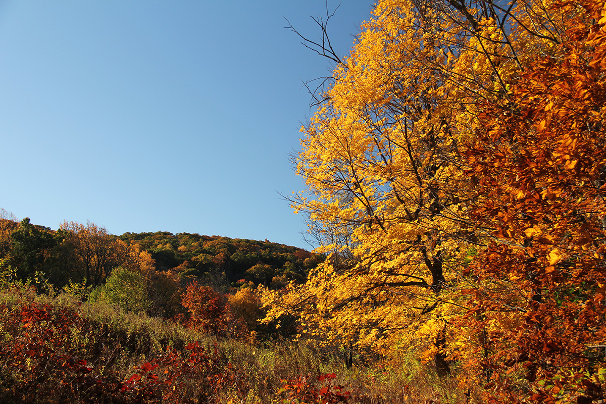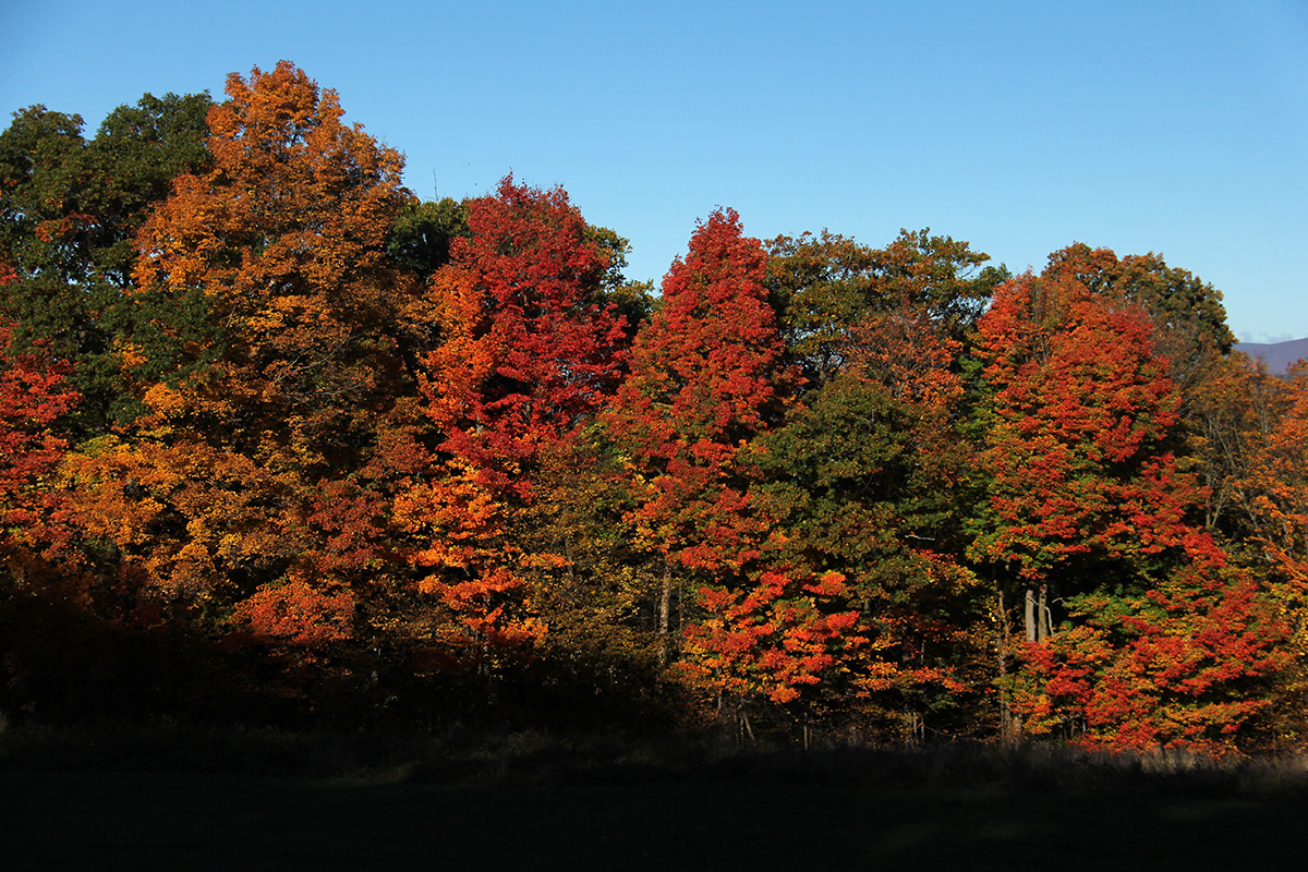 there were a few cars already, but it was mostly empty. walking down to use a compost toilet, i saw group of college kids huddles together in a pre-hike prayer. the air was still a little brisk that early in the morning, but we were certain it'd warm up as the day progressed. the bigger issue was the winds, which made it felt that much colder in the shadows. the morning light hitting a grove of maples gave us a taste of the colors we'd see out on the trails.