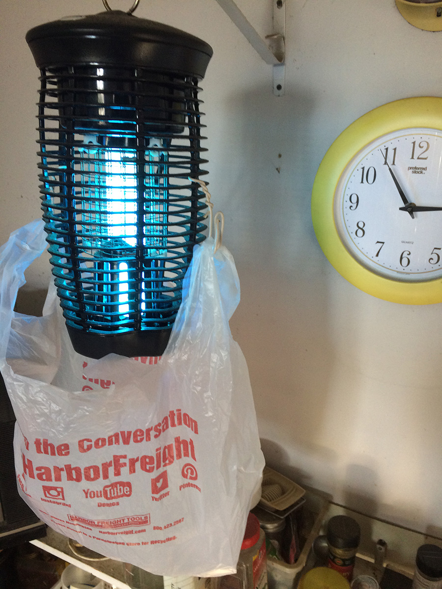 i went to the cafe because my father wanted me to rake some dead leaves in the parking lot. when i got there however, there was hardly any leaves to be raked. my father wasn't there either, went to go see the doctor about his knee pains, turning out it's swelling from a bursa inflammation. the doctor told him to go home and rest, elevating and icing the knee. that left my mother stranded at the cafe without a car, but she said she was going to walk home instead. i brought my spare motorcycle helmet and said i could give her a ride but she said she was too scared. so instead i went to belmont and waited for her to call so i could come pick her up with the car. before i left i connected the bug zapper to take care of some fruit flies that've taken up residence in the cafe.