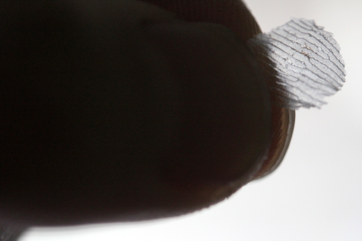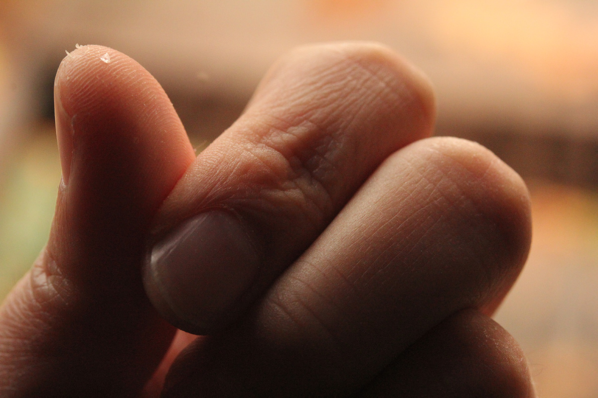 after i finished eating my lunch, it was time to peel off the dried glue. i examined the glue patch to see if there was any glass shard attached but there was none. at first i thought maybe the glue trick worked, but when i pressed down on the puncture spot, it still hurt, so i knew something was still inside. i started to get worried. maybe i needed to go see a doctor about this. but before i do, i should try digging around the wound area with a knife to see if i can pry out the glass. i had a leatherman micro but the knife on that wasn't sharp enough. so i used the sharpest knife i had: an x-acto knife (disinfected with some alcohol).