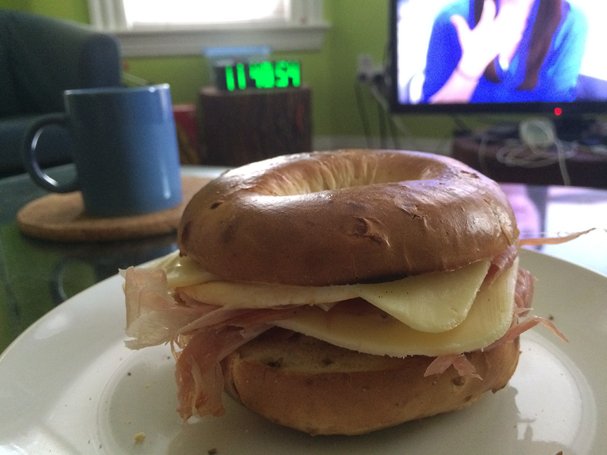 i was sort of hoping the pain would just go away on its own (like somehow my body would naturally eject the foreign glass material) but the pain was still there this morning, so much so that i devoted all my attention to finally removing the glass splinter. i first tried soaking my foot in an epson salt bath for 20 minutes. i thought it worked, but when i walked on the foot, the pain soon came back. the soak did seem to open up the puncture area a little bit more. so i tried covering up the region with some white elmer's glue and peeling off the glue once it dried, hoping to pull out the glass splinter in the process. while waiting for the glue to dry, i made lunch: an onion bagel sandwich with egg, swiss cheese, and prosciutto, all washed down with a mug of almond milk. hobbling around either on my heel or arch was actually more painful.