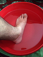 the bottom of the foot is an awkward place on the body to work with. i'm not as limber as i used to be, and contorting my body so i can see the bottom of my foot presented some challenge. plus with my failing eyesight, the distance from eye to foot is such that i can't see it clearly without my glasses, but with them on i can only focus at a distance. looking at the entry wound, i couldn't see anything else, but when i pressed down it'd hurt, which made me think i might've stepped on a piece of glass. glass splinters are the worst because they're virtually impossible and therefore hard to see.