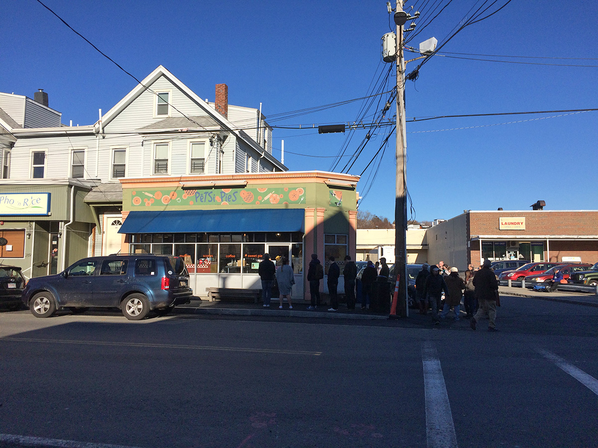 i went to the liquor store around the corner to pick up a six-pack of woodchuck hard cider ($10). i showed the owner my id without him asking, but i'm sure he's seen me enough times to recognize me by this point. there was a line outside petsi pies about 20 customers deep.