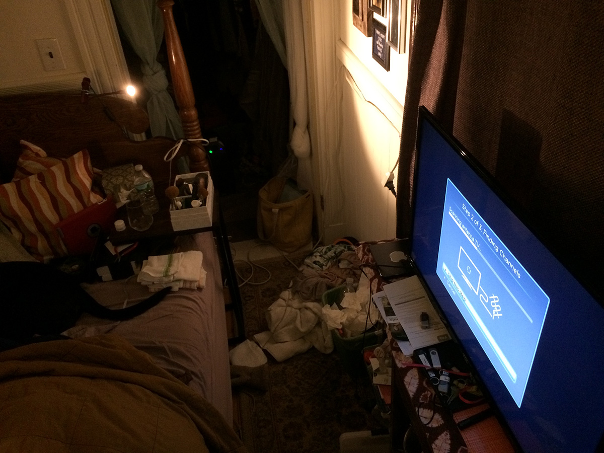 i stopped at the cafe to check out my sister's my TCL HDTV. she was trying to get into HBO but was using the wrong roku channel (HBO GO, not HBO NOW). there is no input button on the roku remote; instead, inputs are just channels, like there's an antenna channel. of course she wasn't getting any over-the-air channels because her paperclip makeshift antenna was too small and the HDTV was located in a central part of the house away from windows.